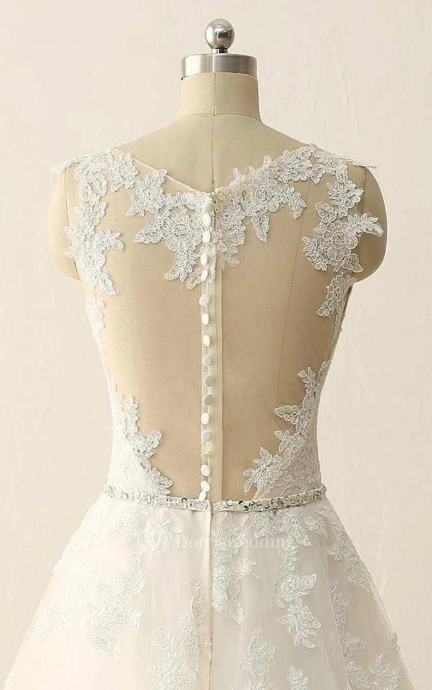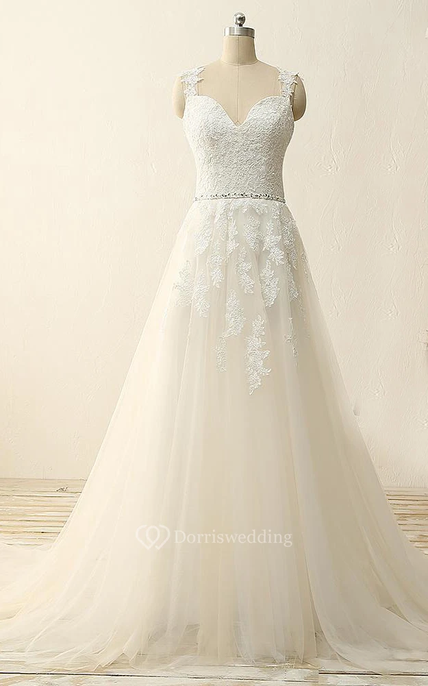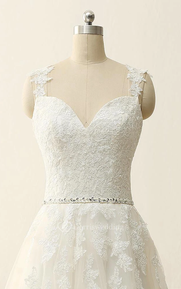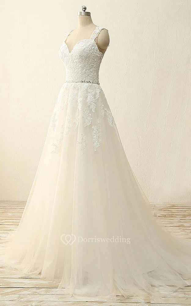 A-Line Tea-Length Straps Sweetheart V-Neck Sleeveless Beading Appliques Sweep Train Straps Tulle Lace Sequins Satin Dress