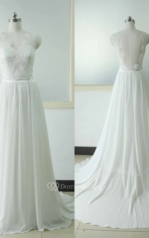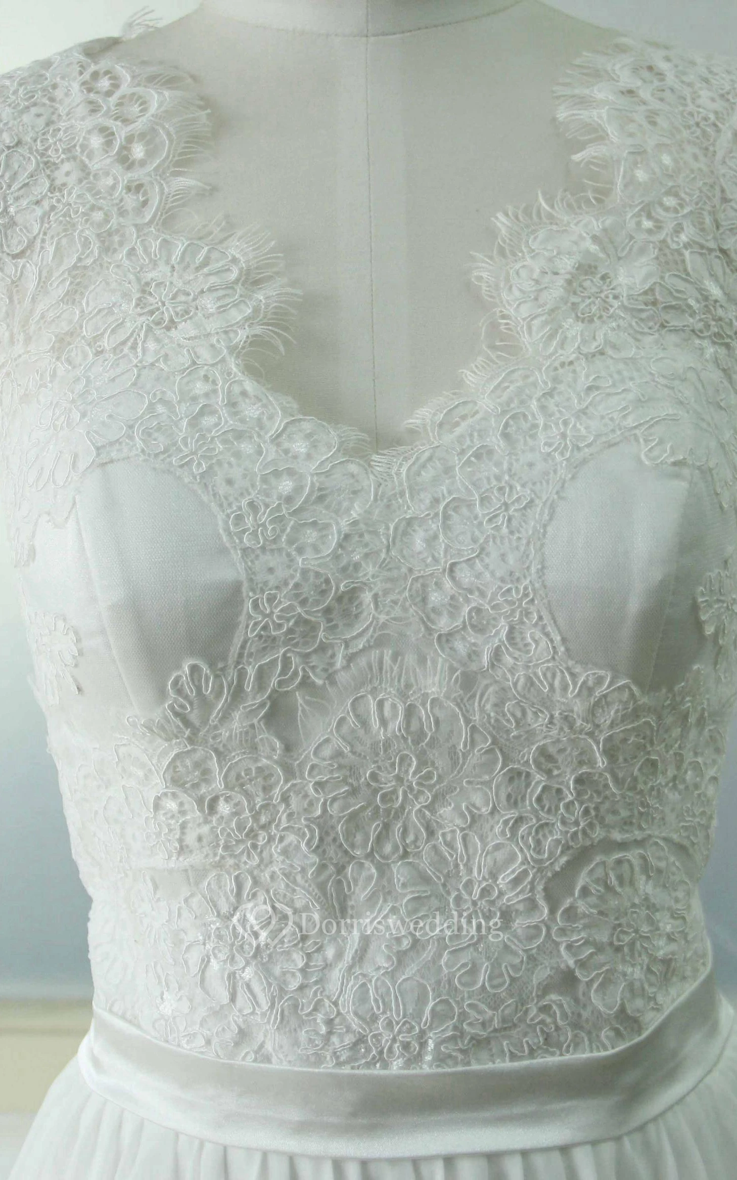 A-Line Tea-Length V-Neck Sleeveless Flower Zipper Corset Back Chiffon Tulle Lace Satin Dress