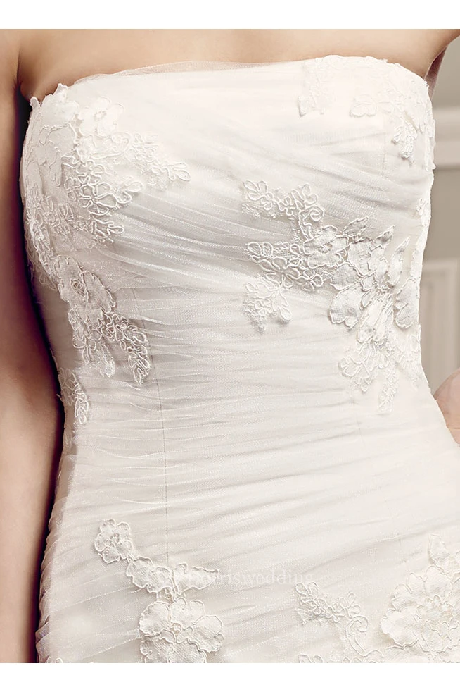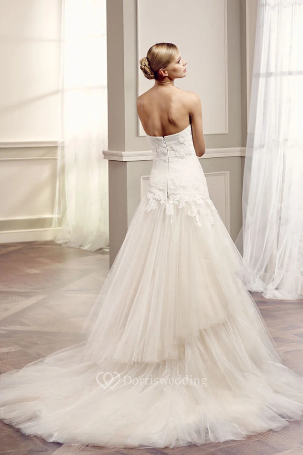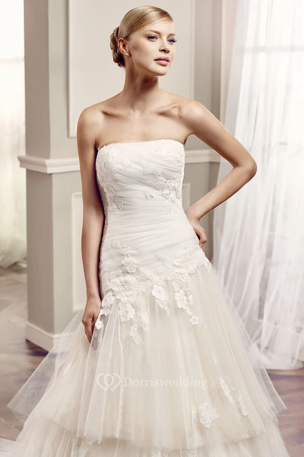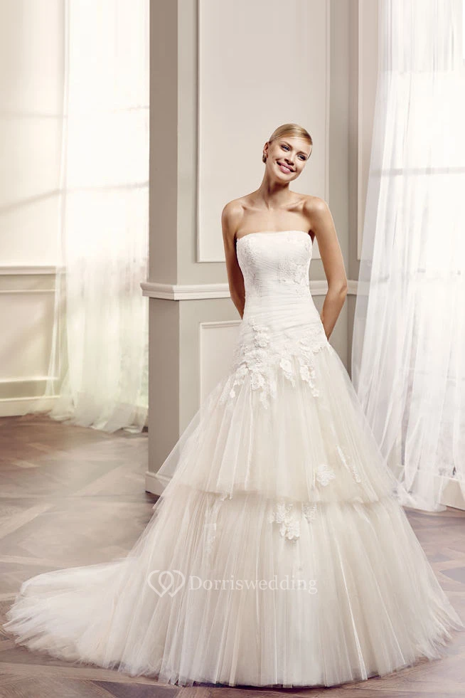 A-Line Tiered Sleeveless Long Strapless Tulle Wedding Dress With Pleats And Appliques