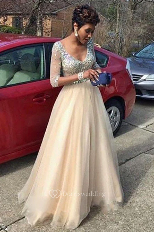 A-Line Tulle V-neck 3 4 Length Sleeve Zipper Dress