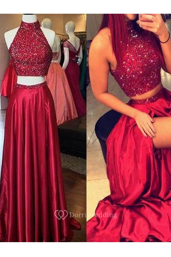 A-Line Two Piece Satin Sequins High Neck Sleeveless Zipper Dress