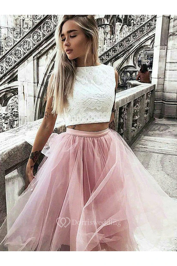 A-line Two Piece Sleeveless Lace Tulle High Neck Zipper Knee-length Homecoming Dress