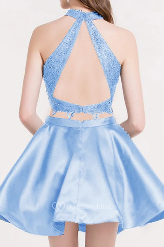 A-line Two Piece Sleeveless Satin Lace Halter Straps Keyhole Short Mini Homecoming Dress