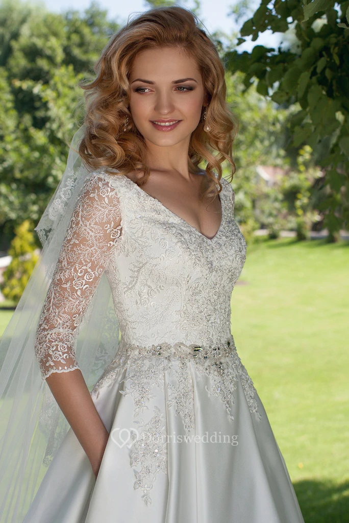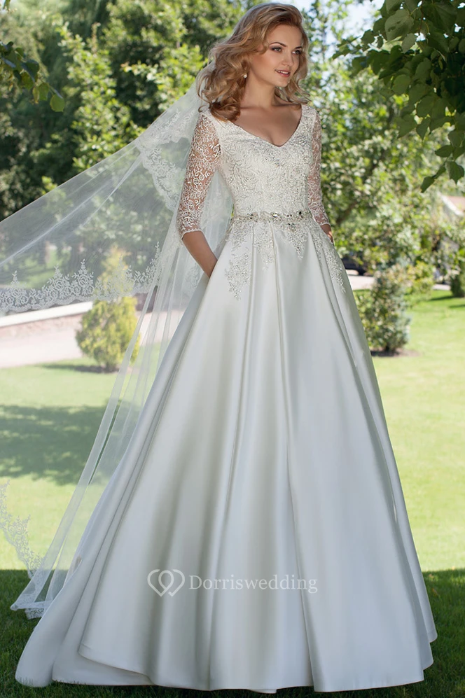 A-Line V-Neck Appliqued 3-4 Sleeve Satin Modest Wedding Dress