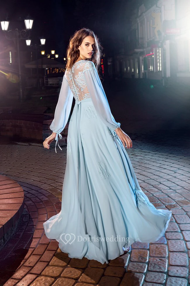 A-Line V-Neck Balloon Long Sleeve Chiffon Illusion Dress With Lace And Draping