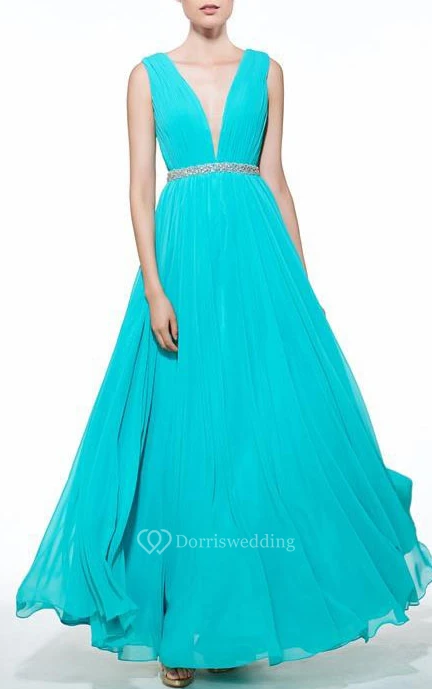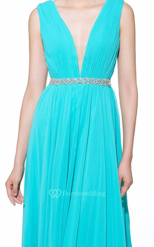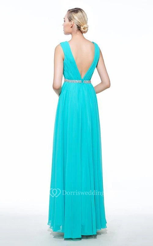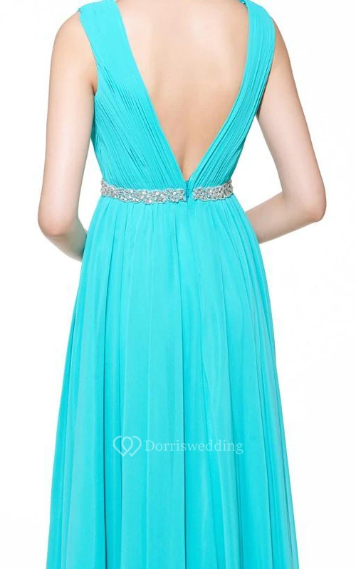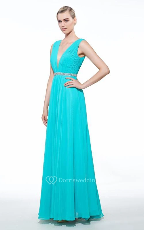 A-Line V-Neck Beading Ruched Floor-Length Prom Dress