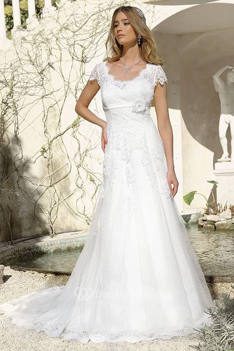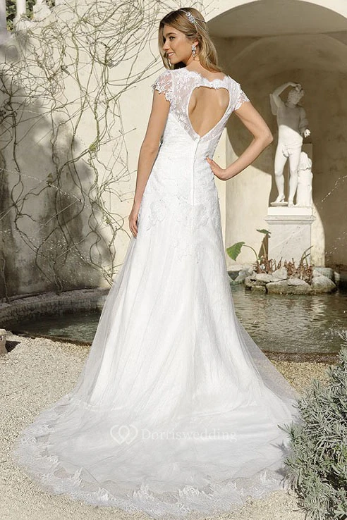 A-Line V-Neck Cap-Sleeve Lace Wedding Dress With Keyhole
