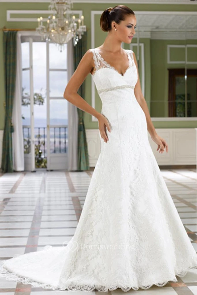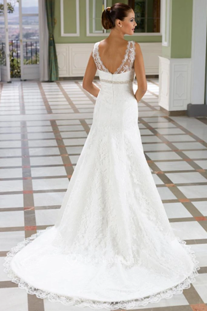 A-Line V-Neck Floor-Length Jeweled Sleeveless Lace Wedding Dress With Court Train And Low-V Back