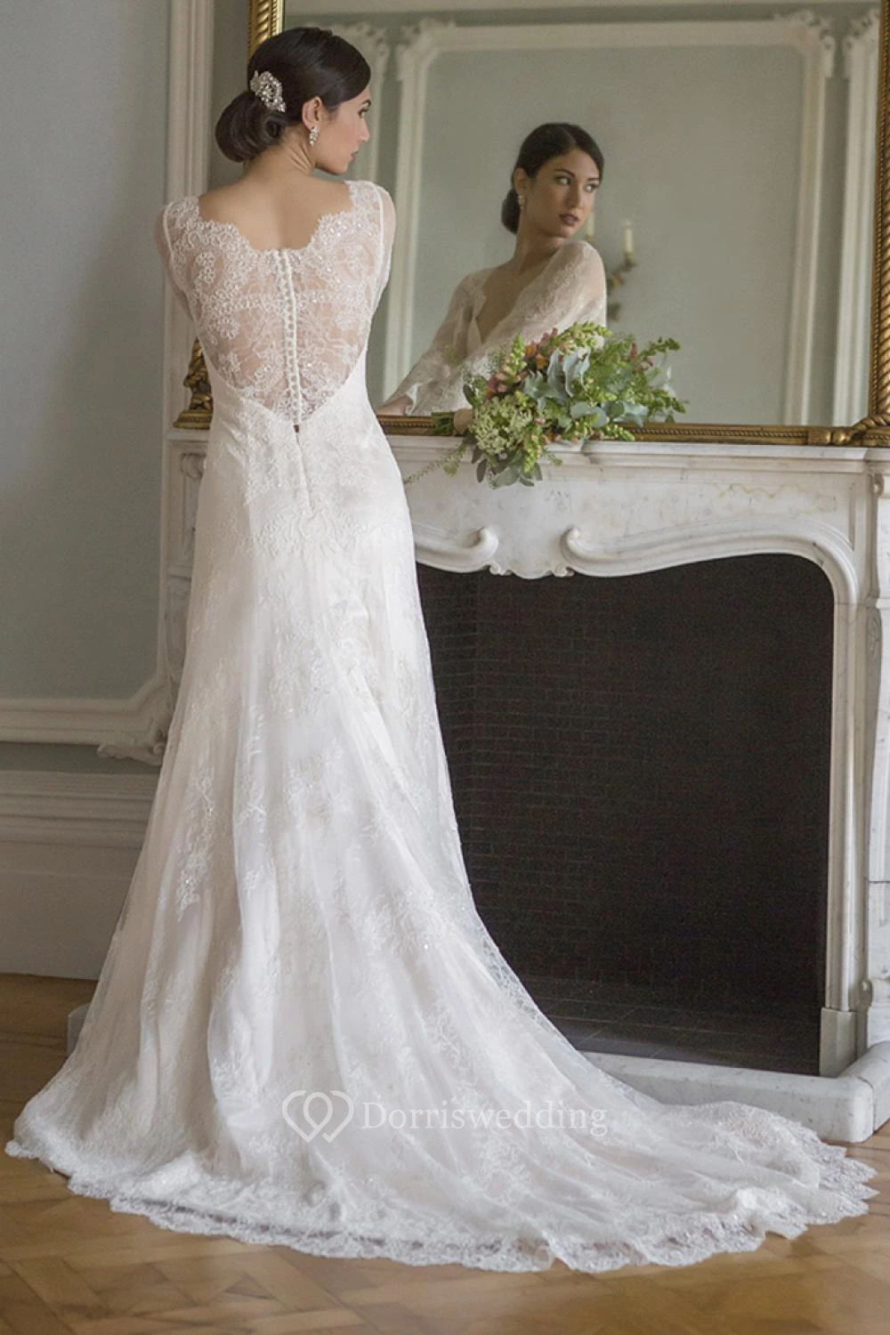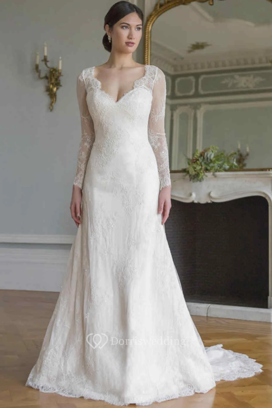 A-Line V-Neck Floor-Length Long-Sleeve Lace Wedding Dress With Illusion