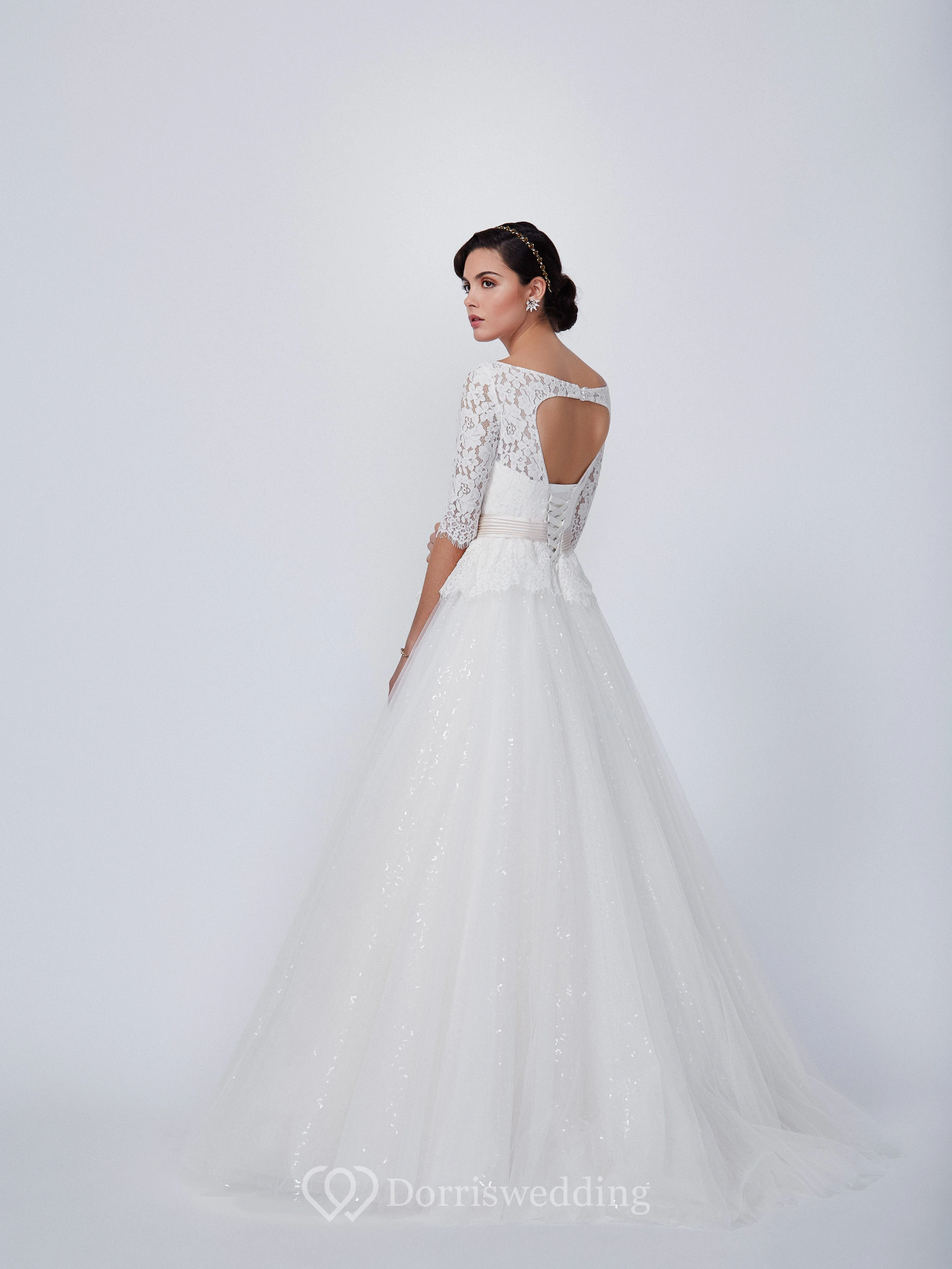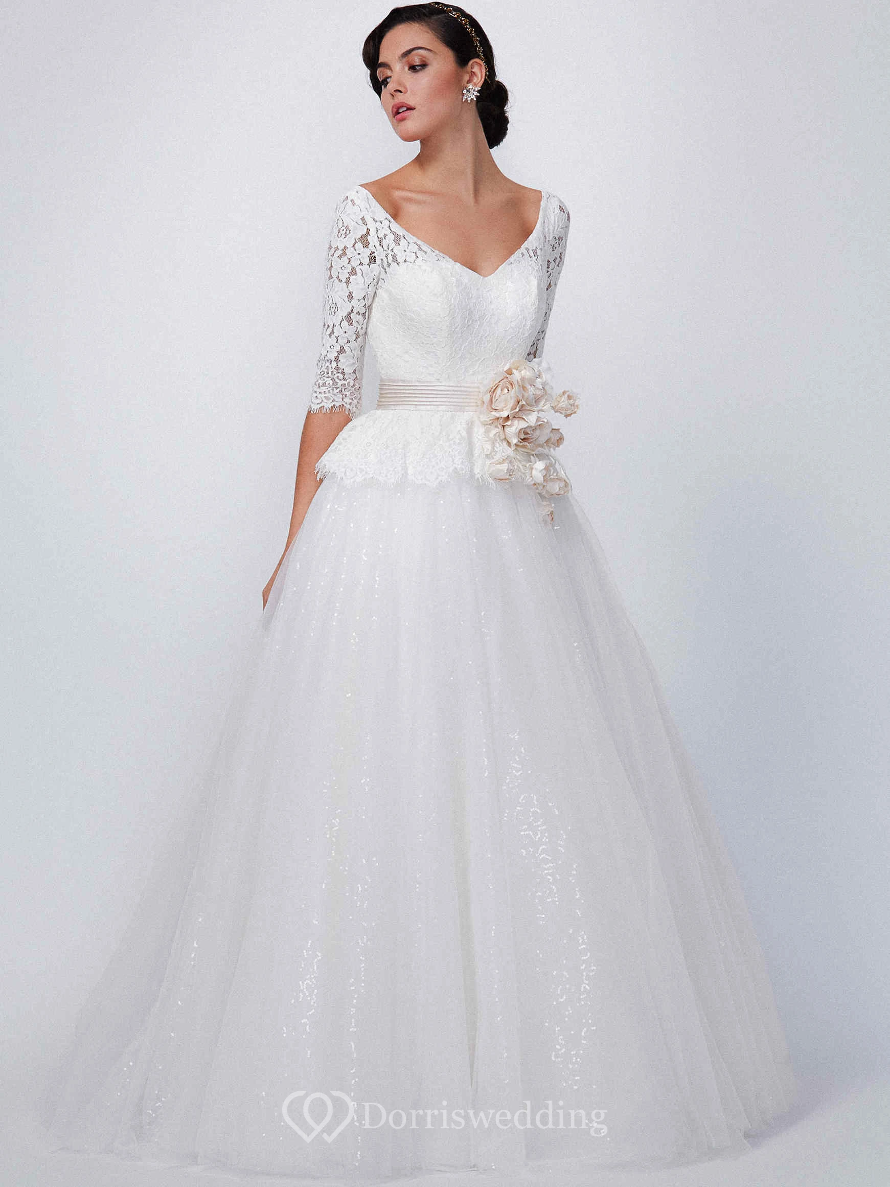 A-Line V-Neck Half-Sleeve Lace Wedding Dress With Flower And Sequins