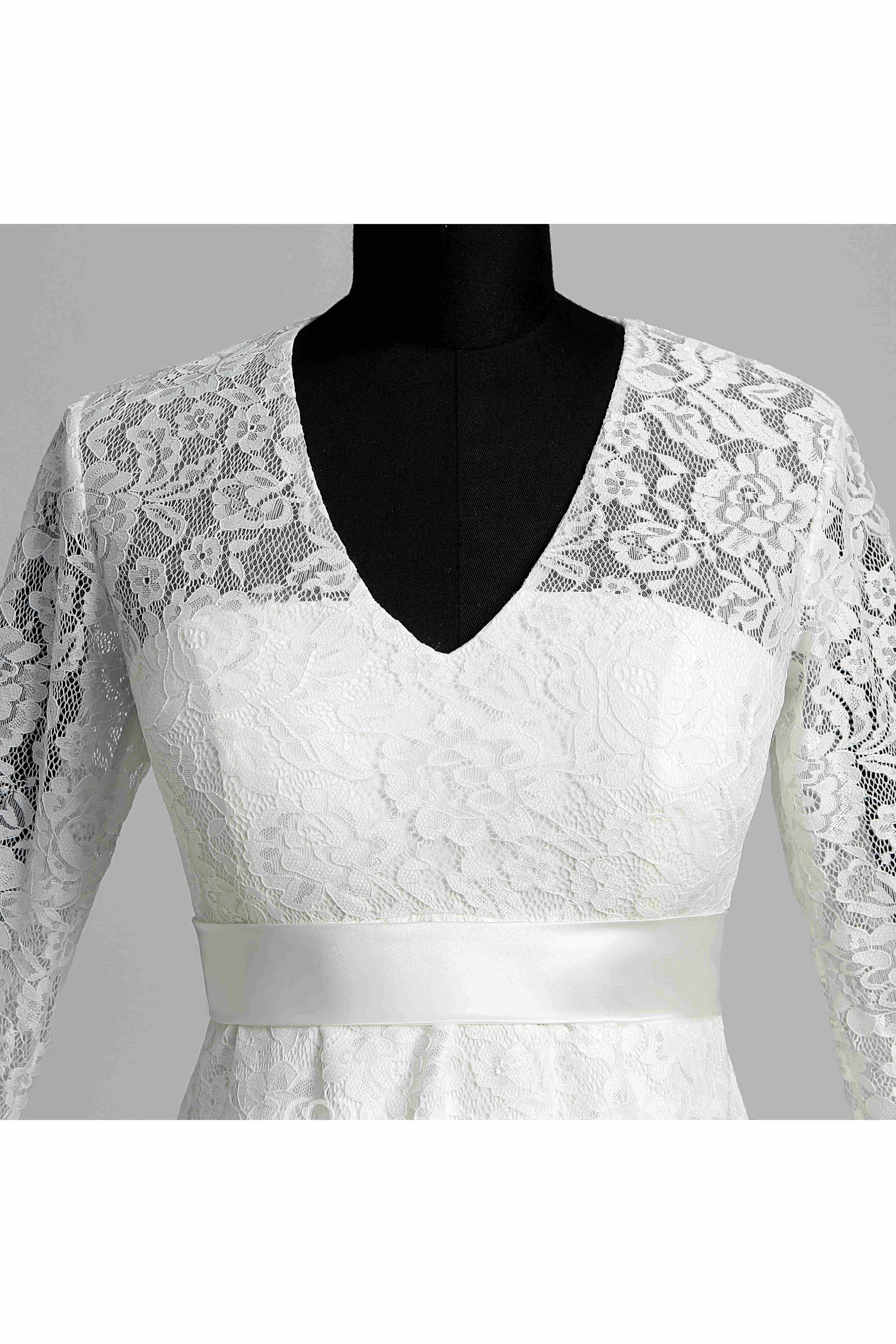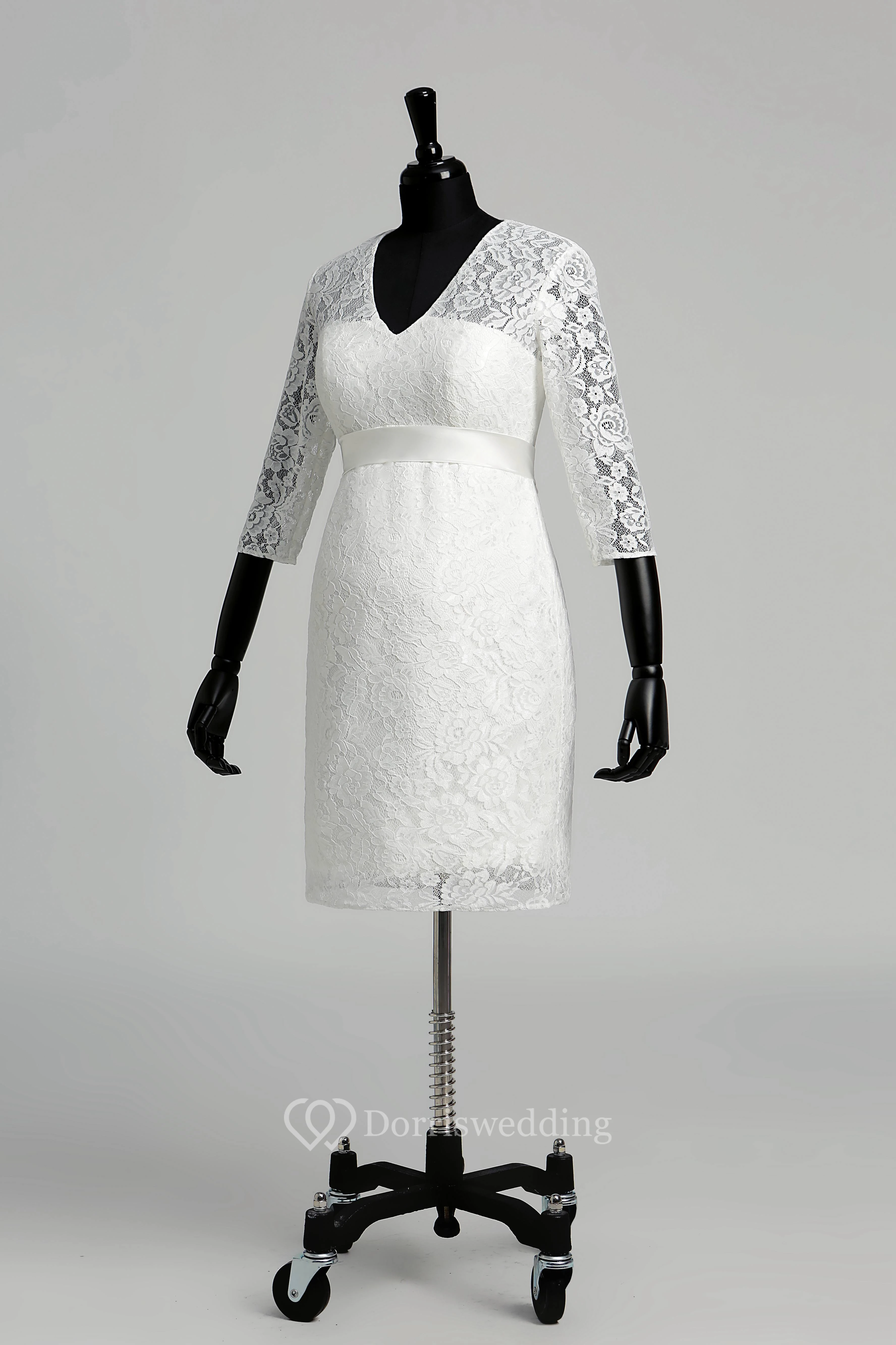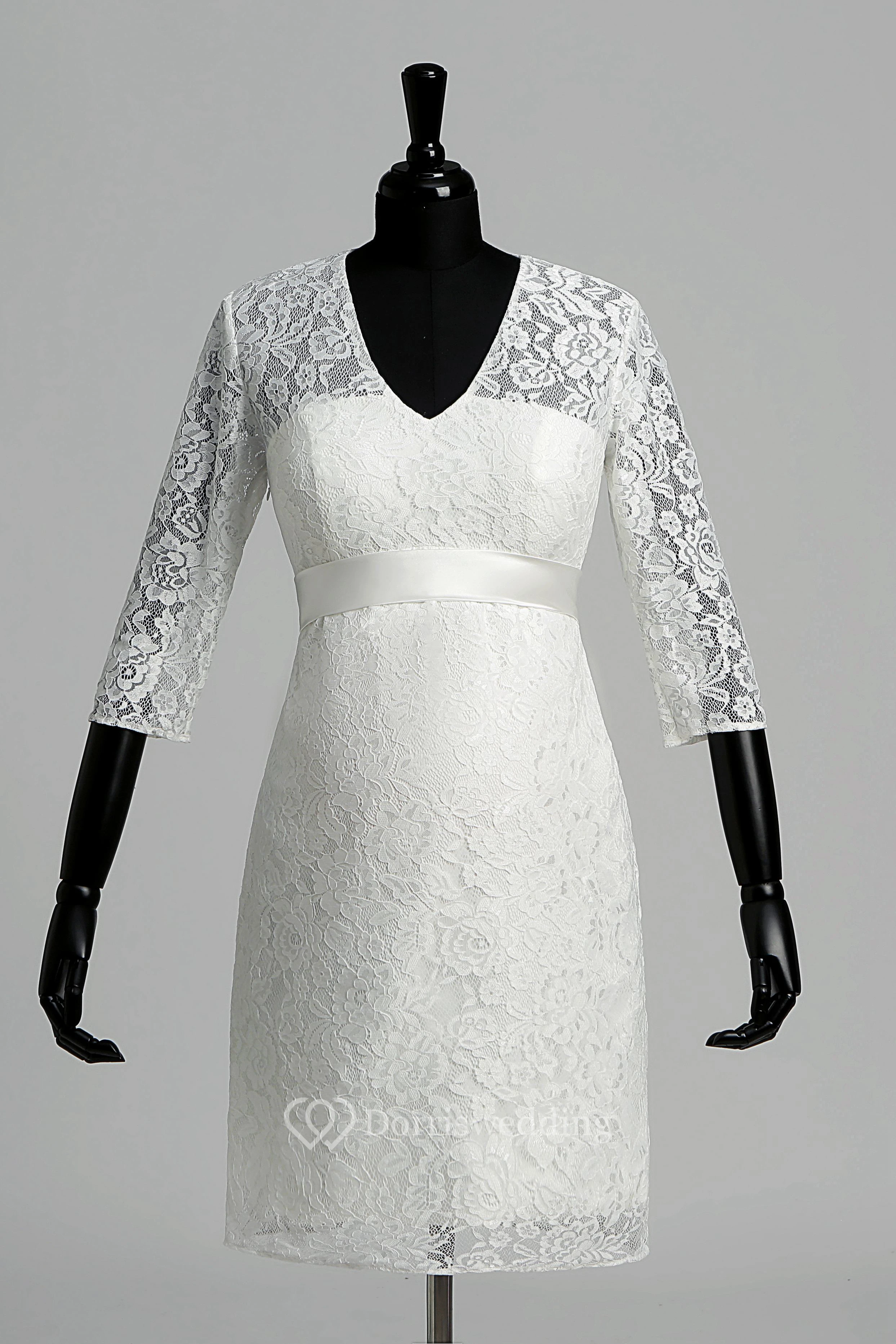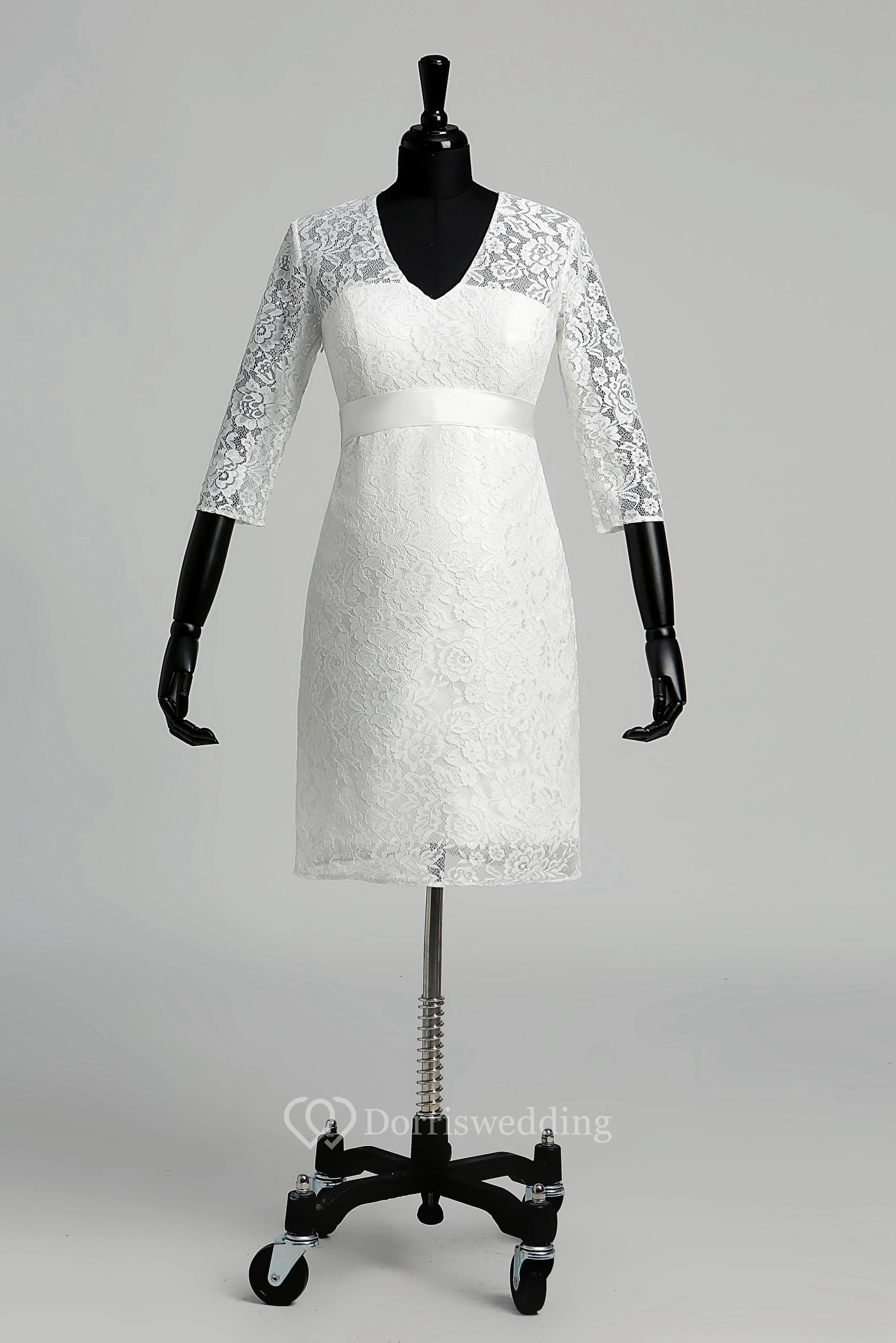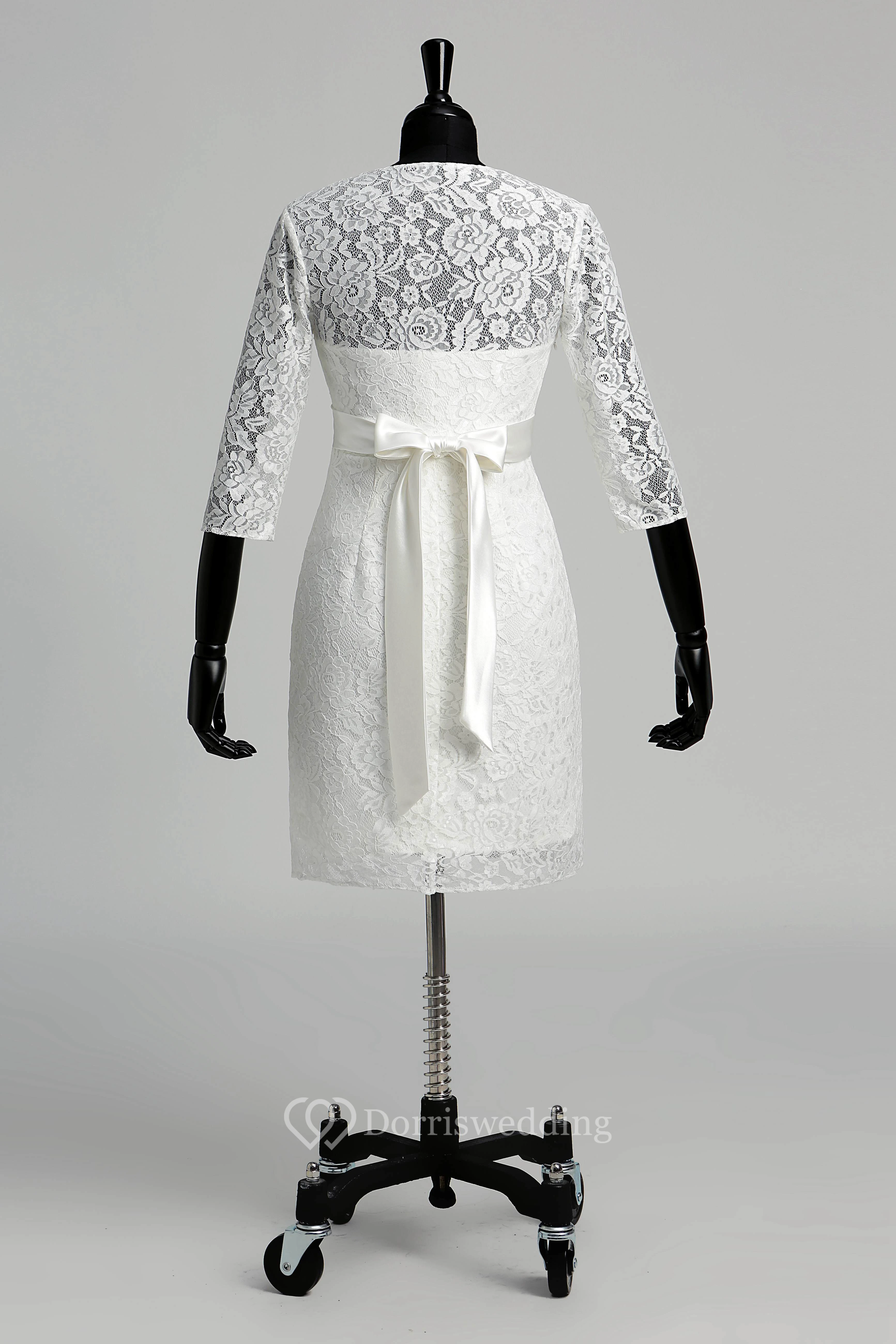 A-line V-neck Illusion 3/4 Length Sleeve Knee-length Lace Wedding Dress