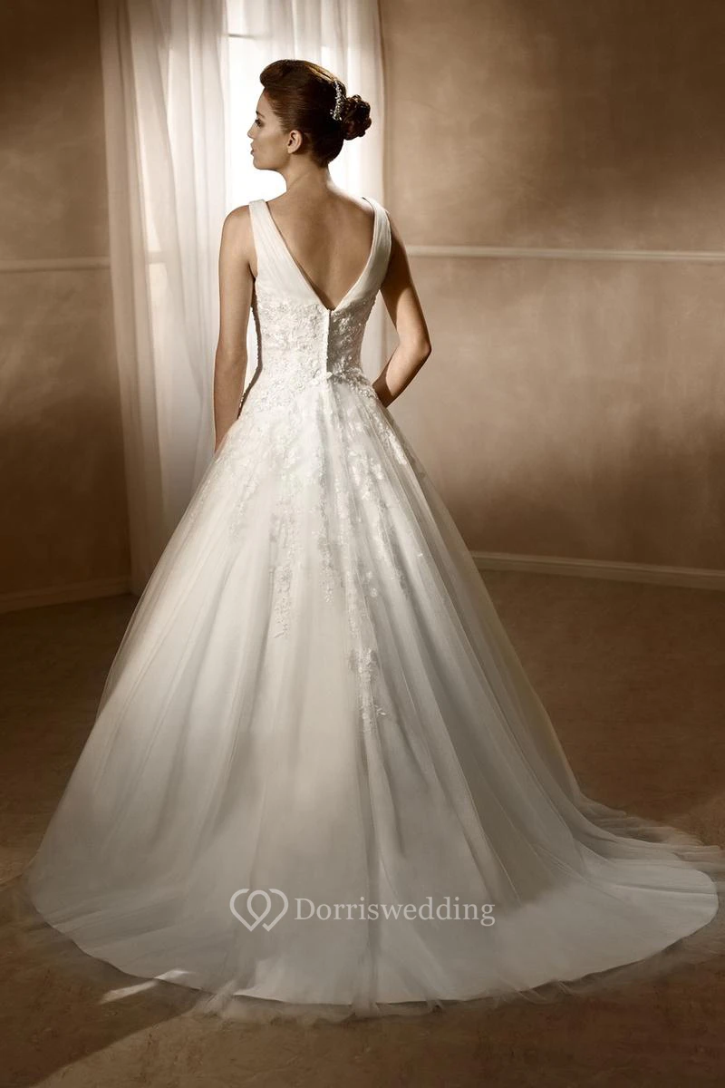 A-Line V-Neck Maxi Sleeveless Appliqued Satin&Tulle Wedding Dress With Court Train And Low-V Back