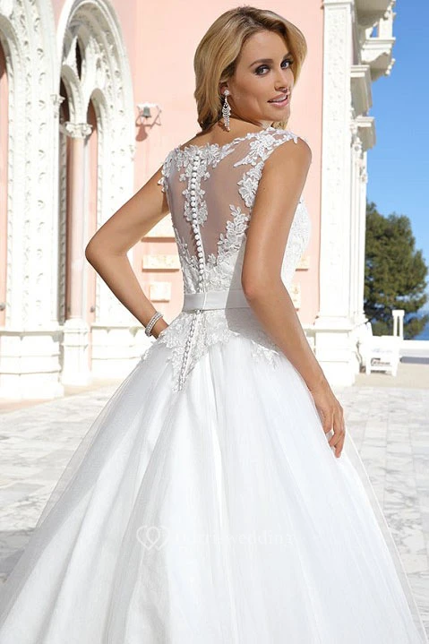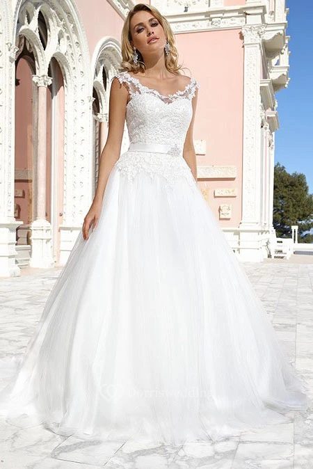 A-Line V-Neck Maxi Sleeveless Appliqued Tulle Wedding Dress With Broach And Illusion Back