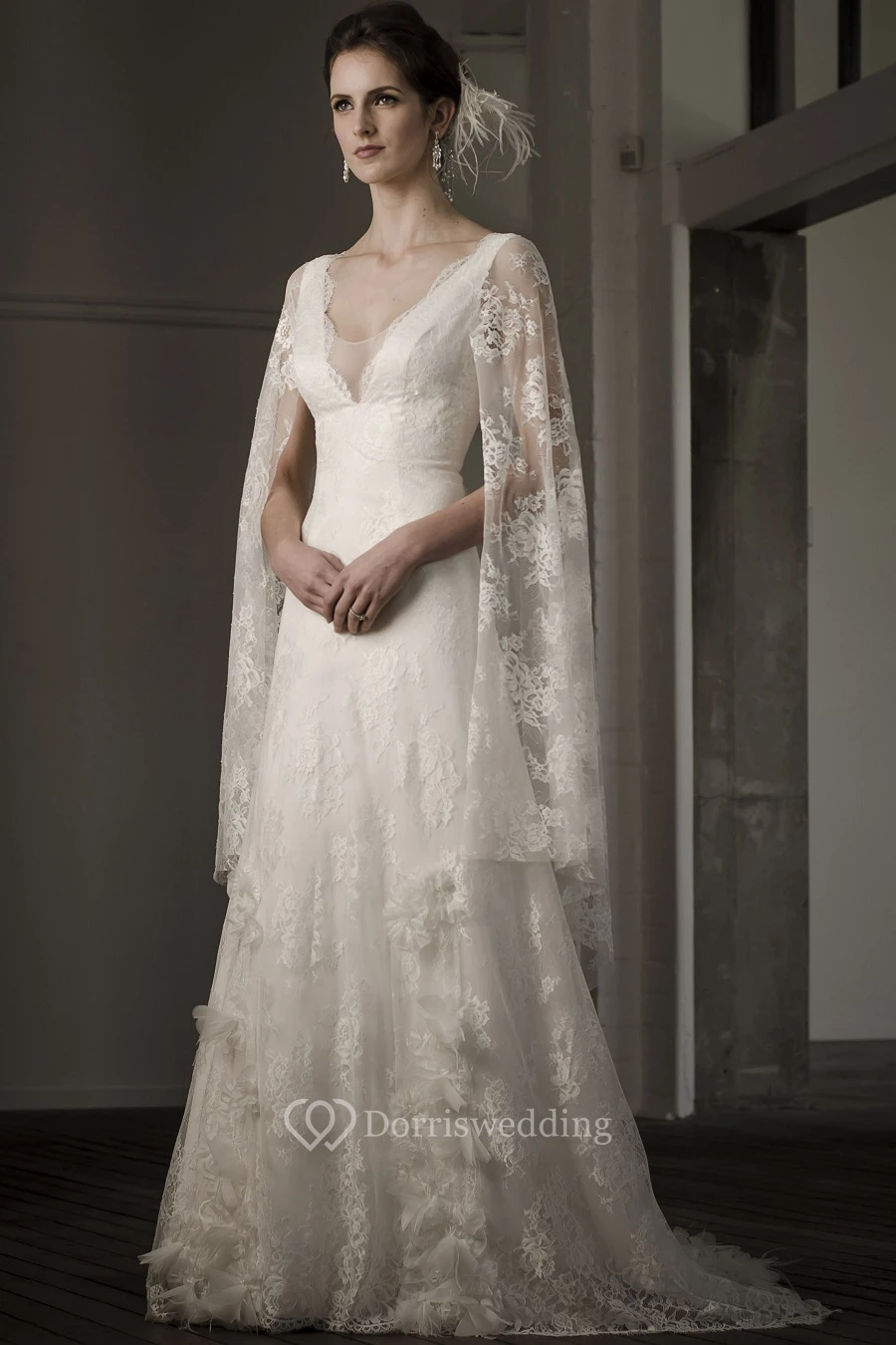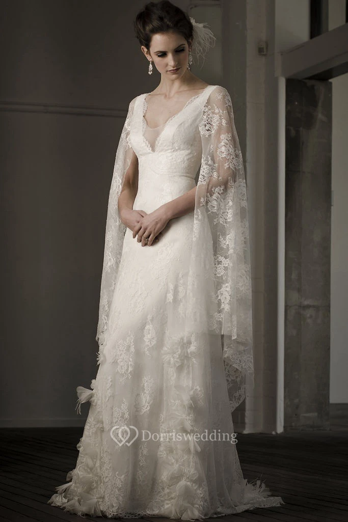 A-Line V-Neck Poet-Long-Sleeve Long Appliqued Lace Wedding Dress With Flower