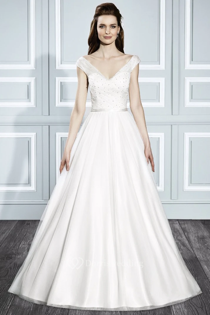 A-Line V-Neck Ruched Cap Sleeve Tulle Wedding Dress