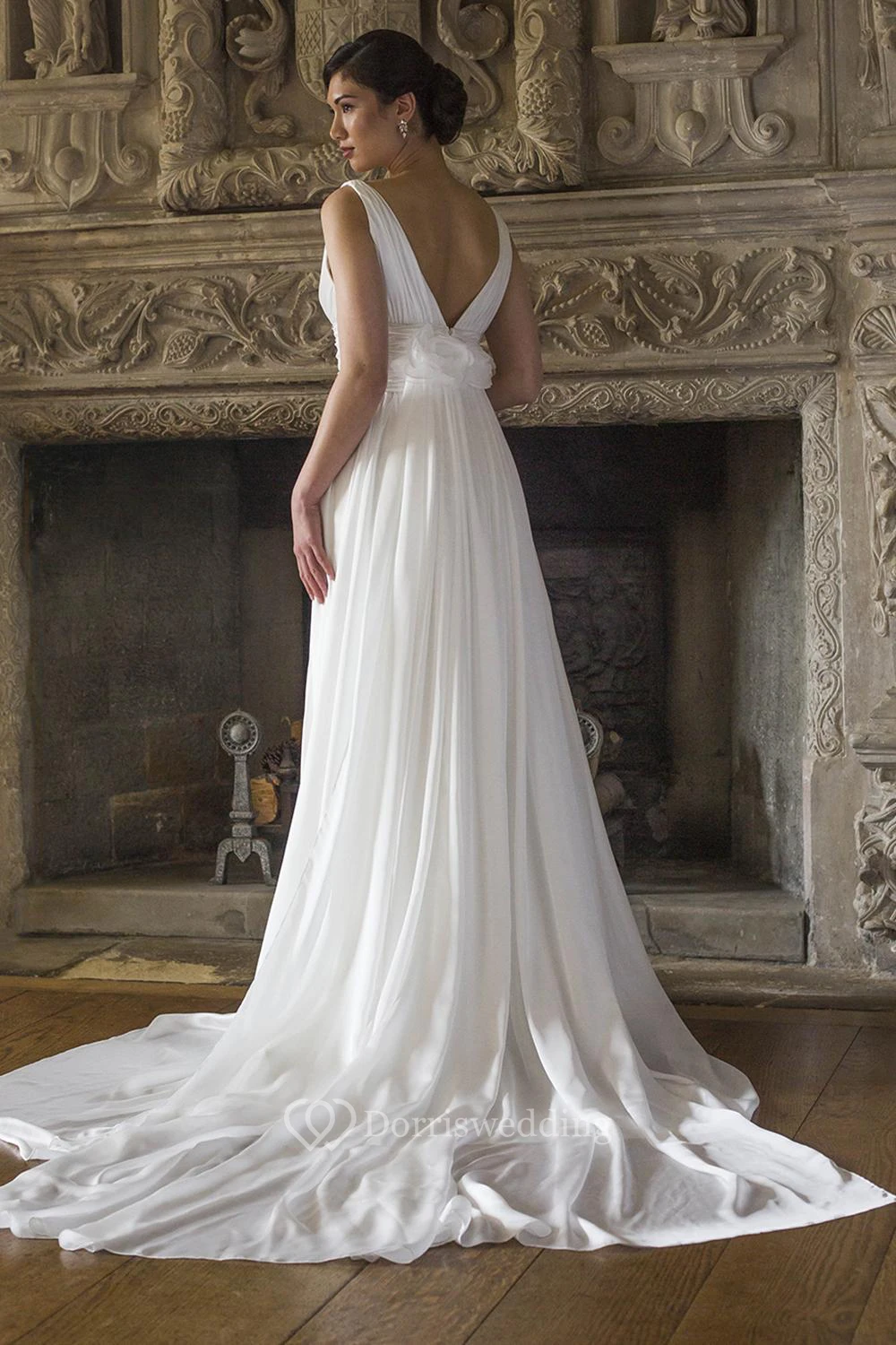 A-Line V-Neck Ruched Sleeveless Floor-Length Chiffon Wedding Dress With Pleats And Flower