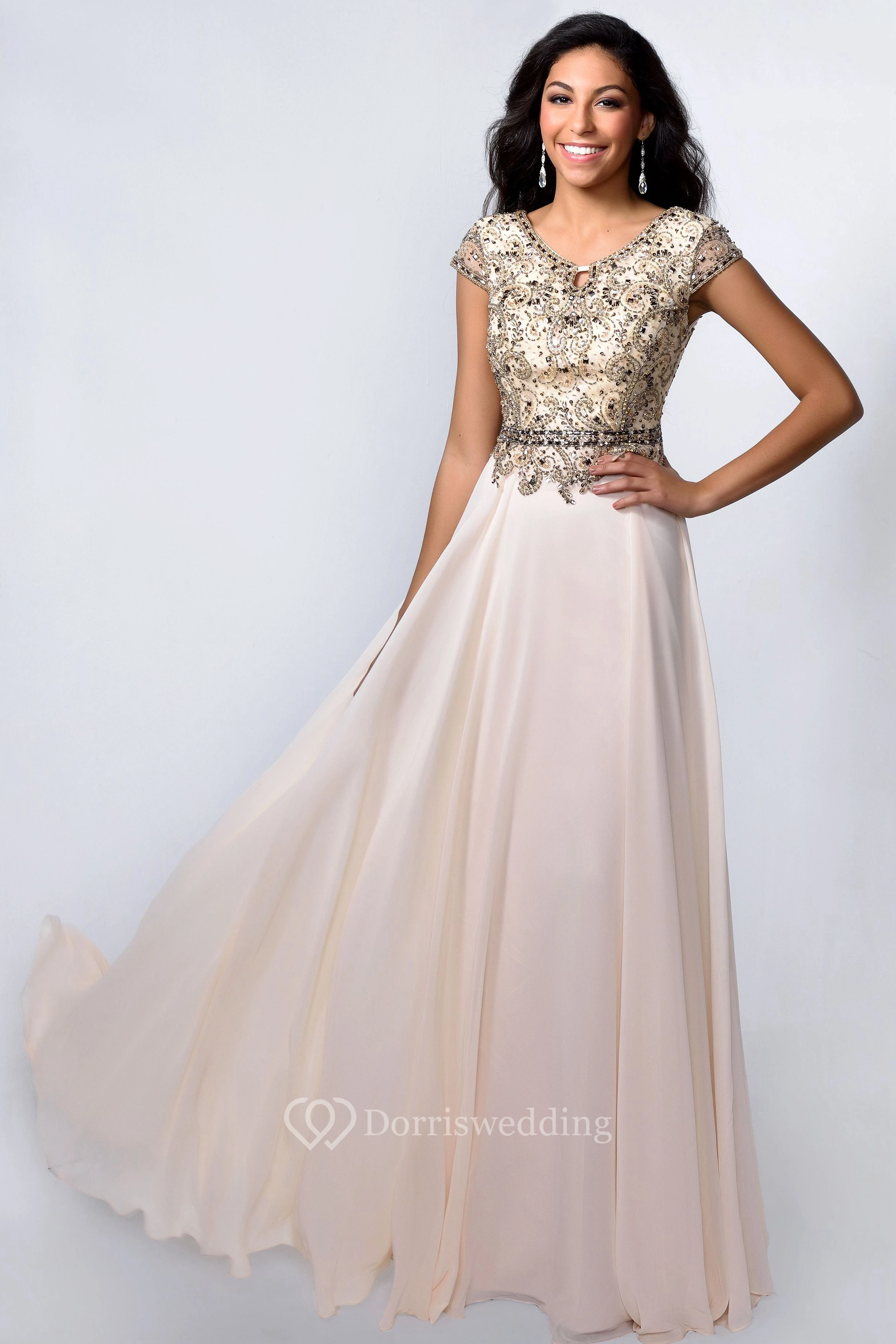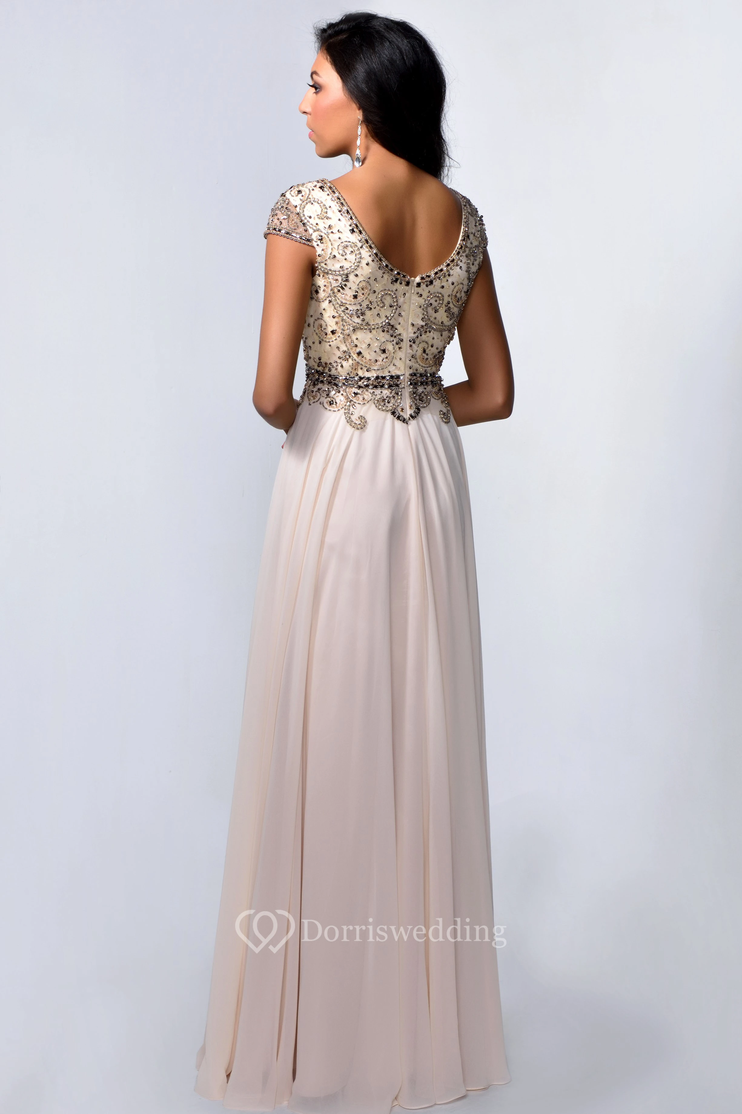A-Line V-Neck Short Sleeve Jersey Low-V Back Dress With Beading And Pleats