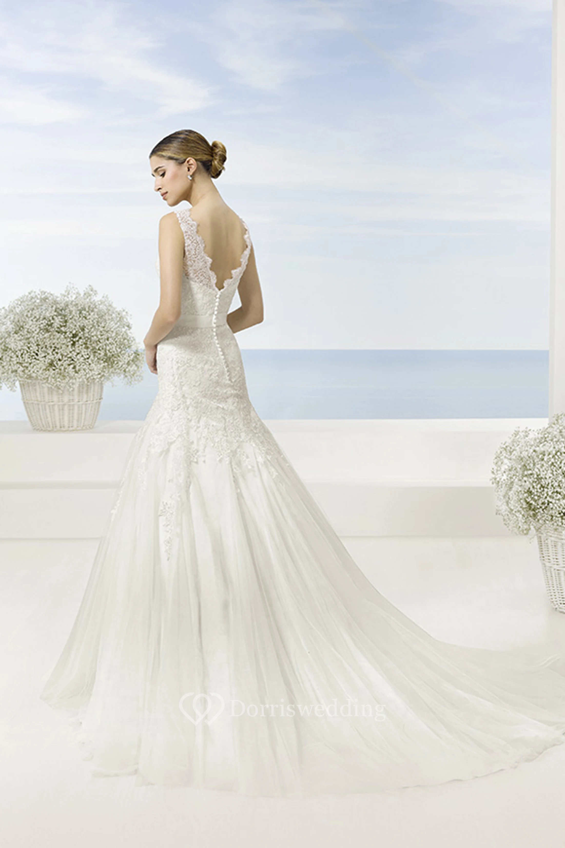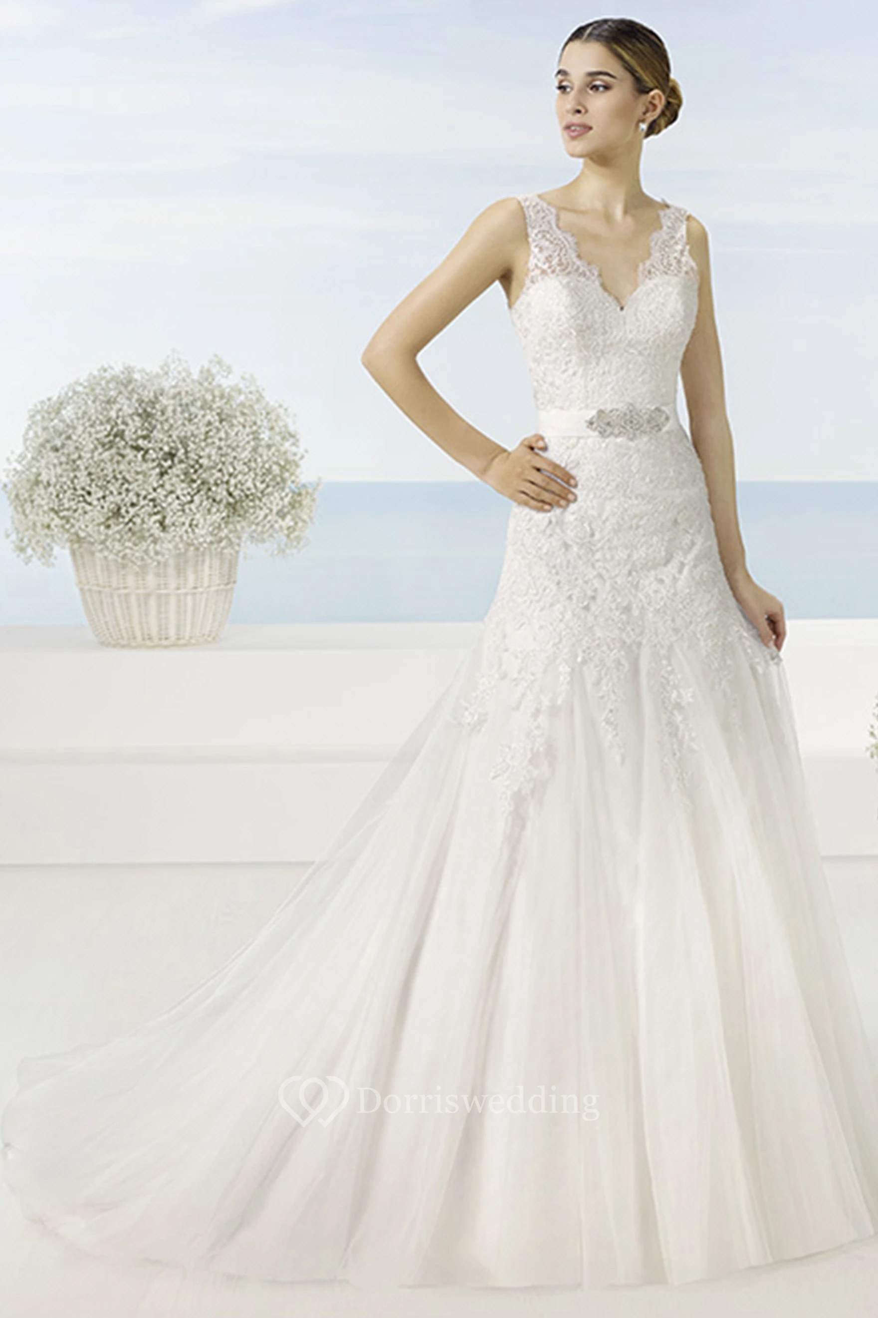 A-Line V-Neck Sleeveless Appliqued Long Lace&Tulle Wedding Dress With Waist Jewellery And Pleats