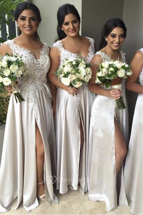 A-line V-neck Sleeveless Appliques Split Front Split Zipper Lace Satin Dress