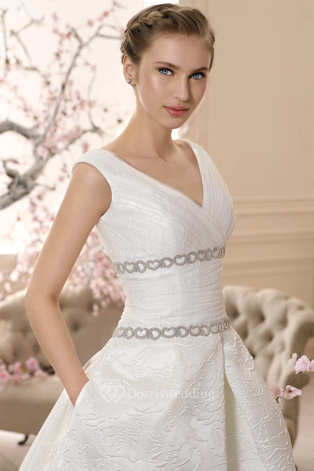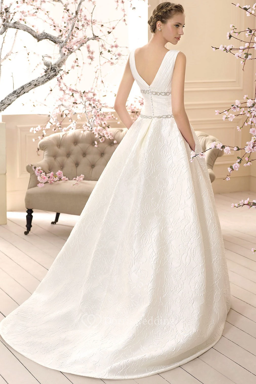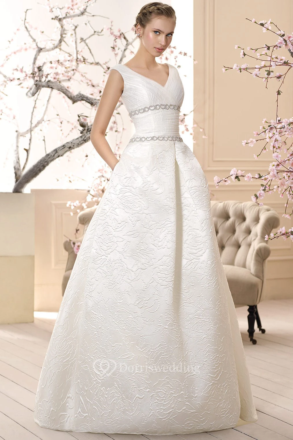 A-Line V-Neck Sleeveless Floor-Length Ruched Wedding Dress With Beading