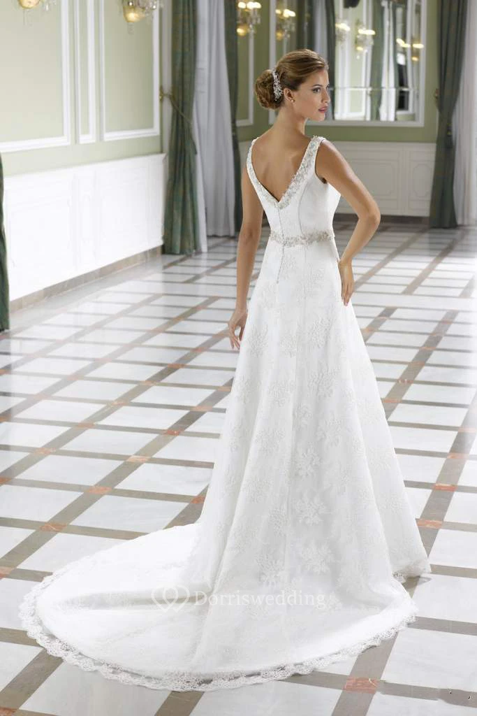 A-Line V-Neck Sleeveless Jeweled Long Lace Wedding Dress With Court Train And Low-V Back