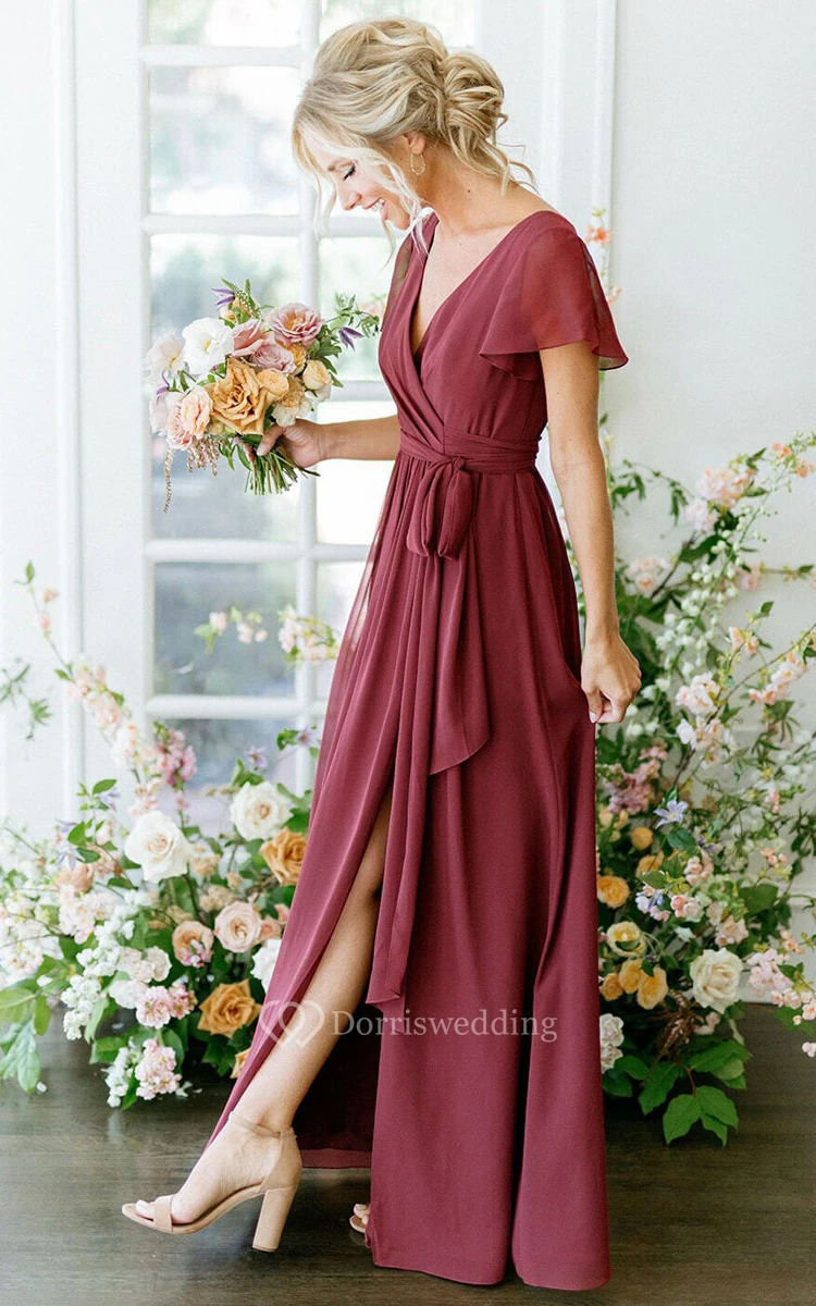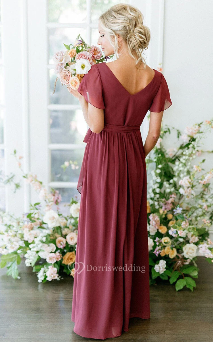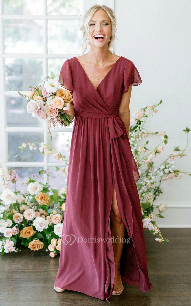 A-Line V-neck Style Cap-Sleeve Floor-length Chiffon Bridesmaid Dress with Front Slit and Ruching