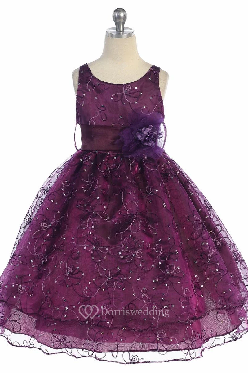 Tea-Length Embroideried Floral Sequins&Organza Flower Girl Dress With Ribbon