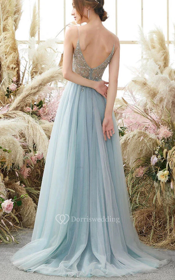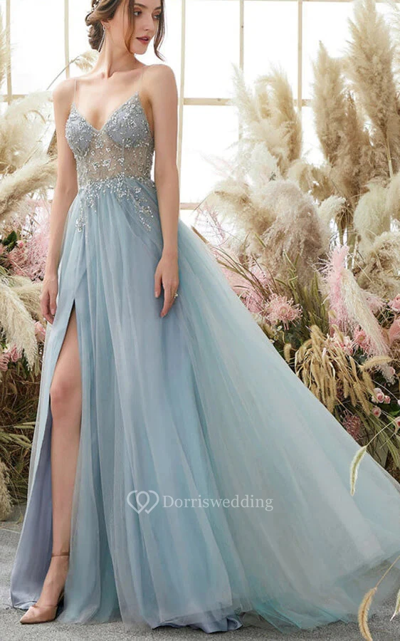Adoring Spaghetti Front Split Tulle Pleated Formal Prom Dress Wedding Dress Beadings