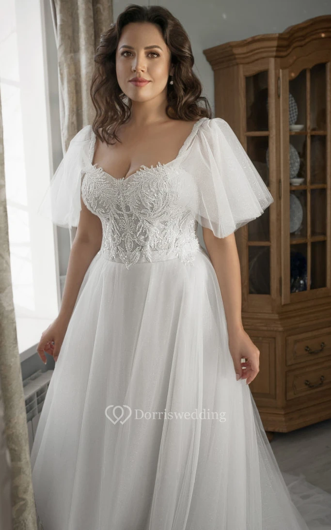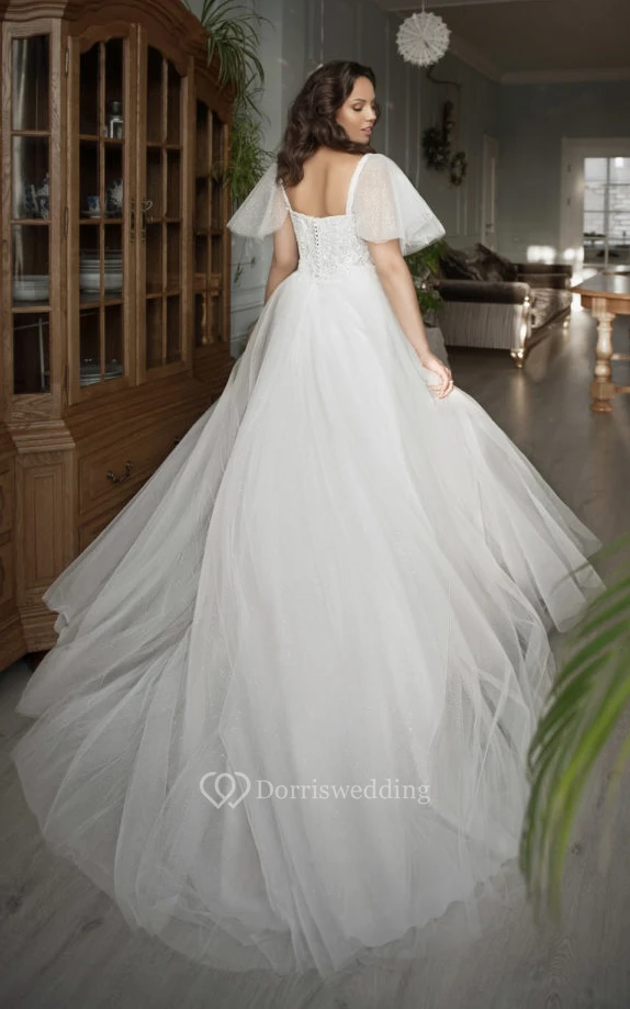 Adroble Plus Size Tulle A-line Short Bell Sleeve Princess Wedding Dress with Beadings