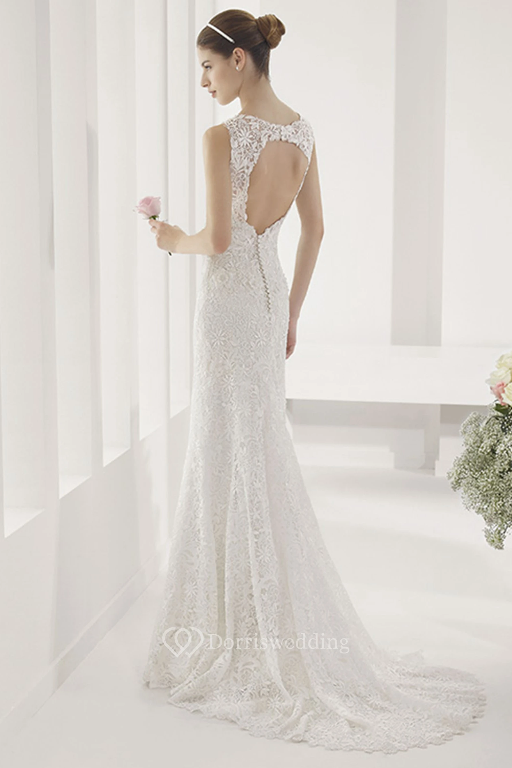 Allover Lace Illusion Neck Sheath Wedding Gown With Back Keyhole