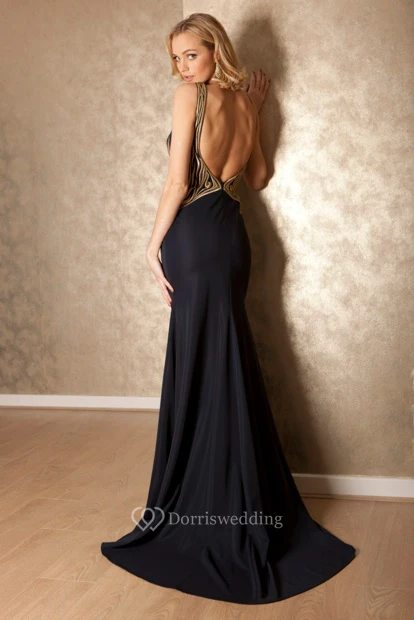 Sheath Scoop Long Sleeveless Jersey Prom Dress With Backless Style And Brush Train