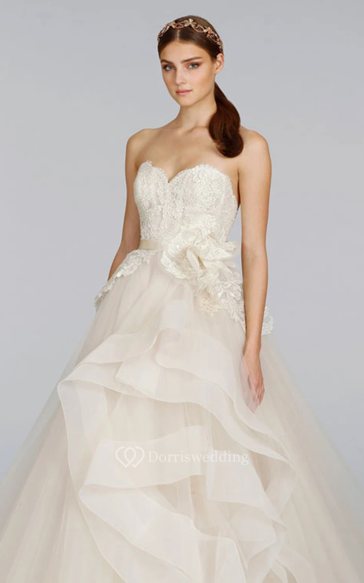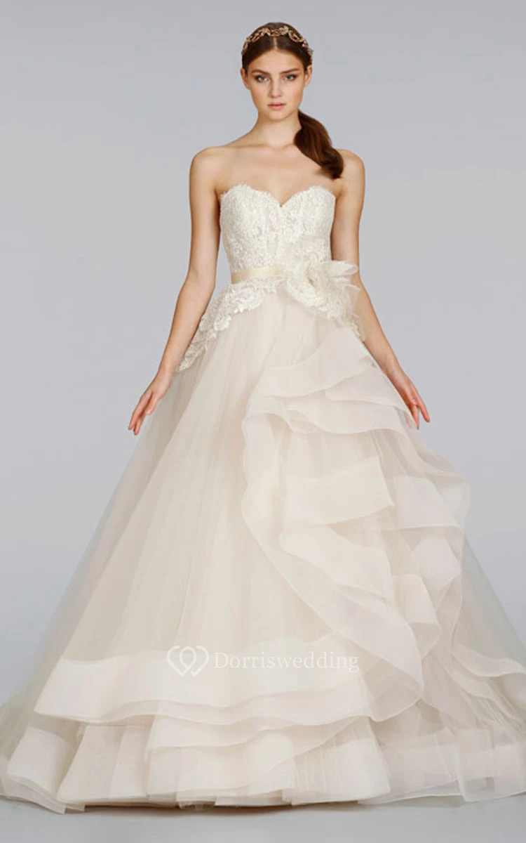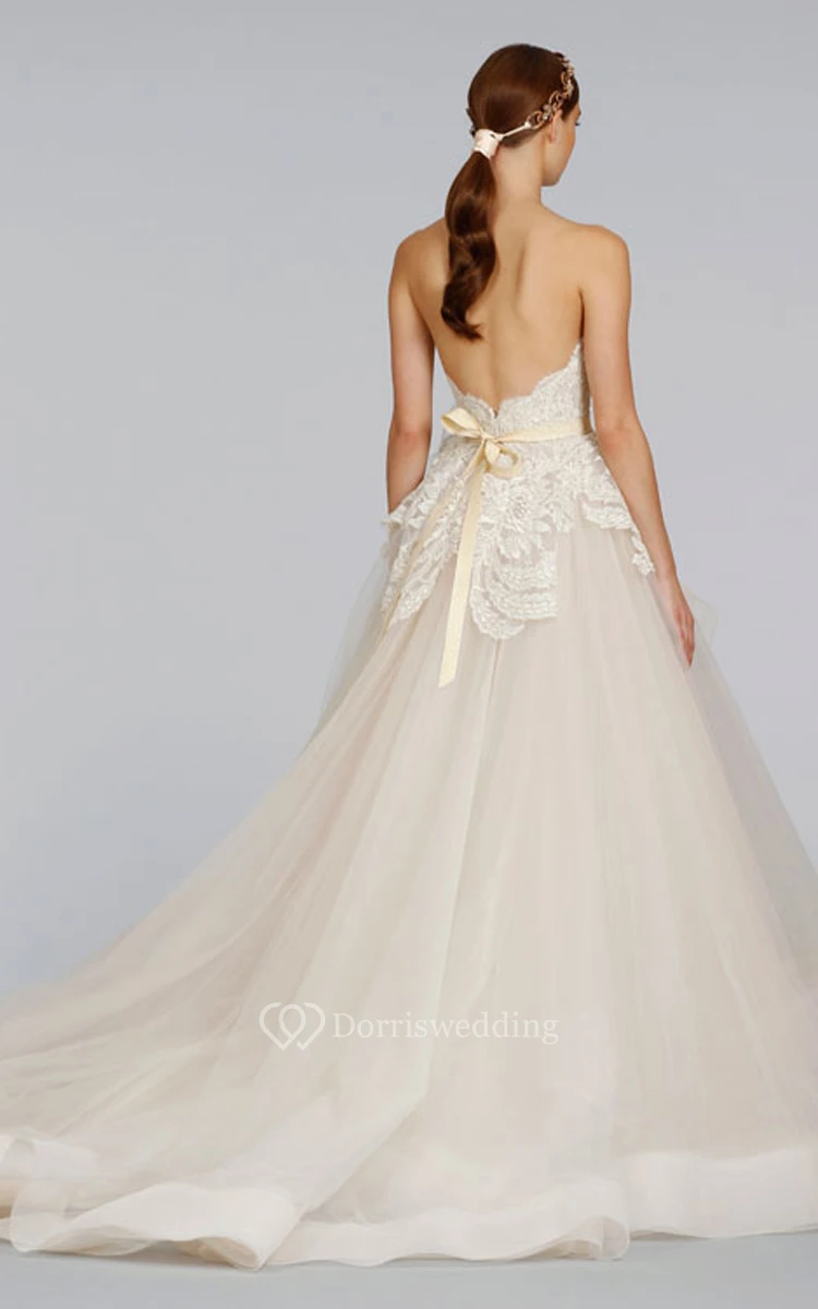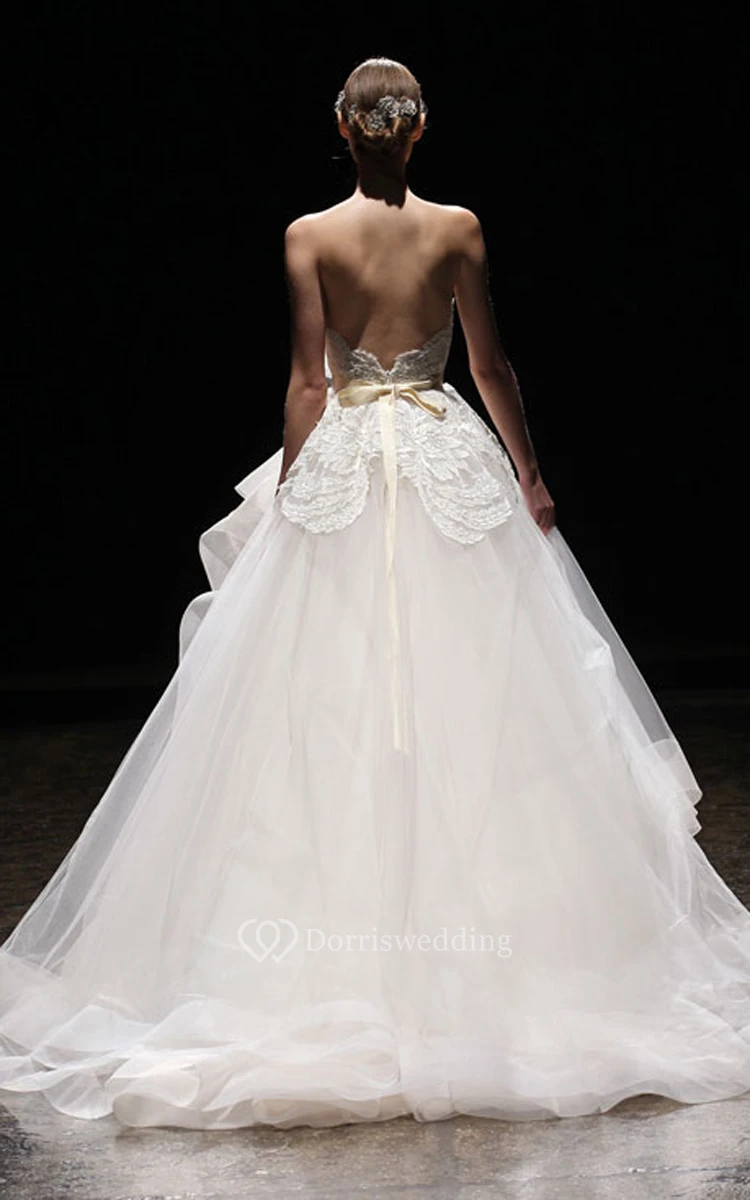 Angelic Sweetheart Lace Bodice Tulle Ball Gown With Peplum and Ribbon