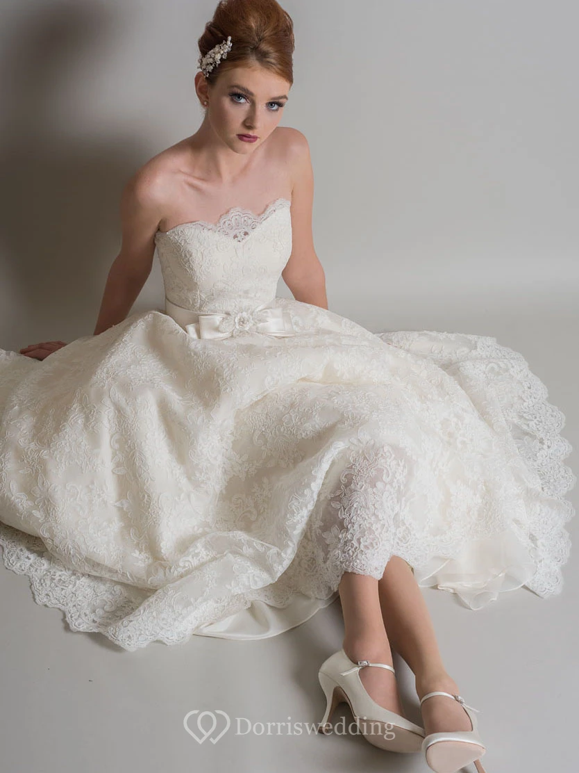 Ankle-Length A-Line Appliqued Strapless Lace Short Wedding Dress With Bow