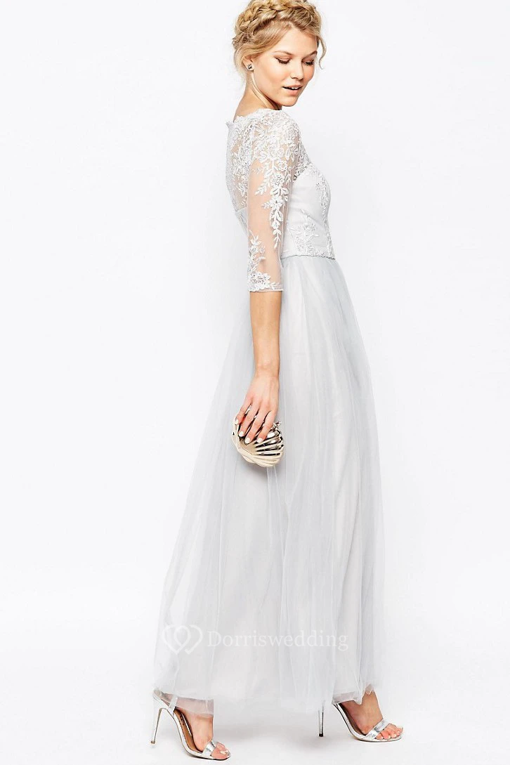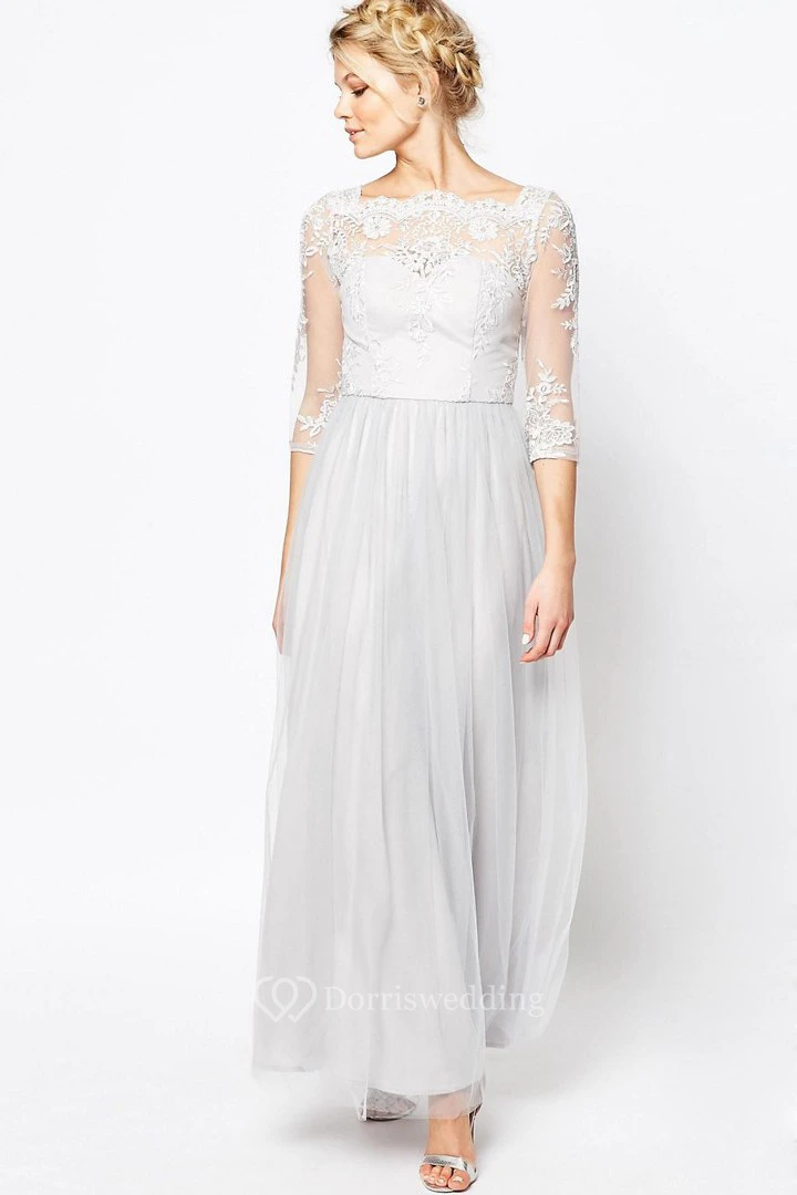 Ankle-Length Appliqued Bateau Neck Half Sleeve Tulle Bridesmaid Dress