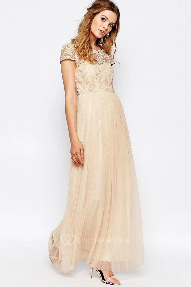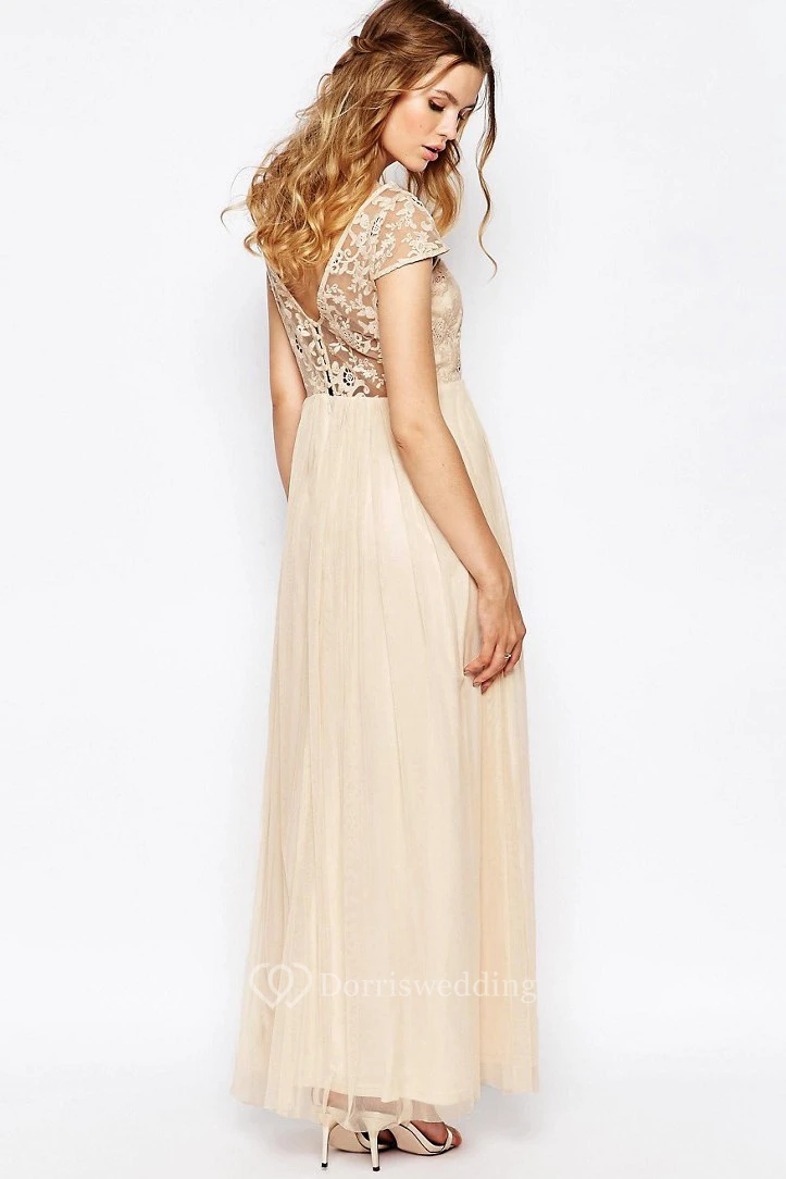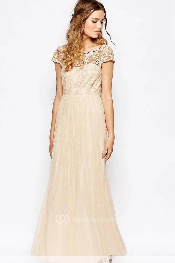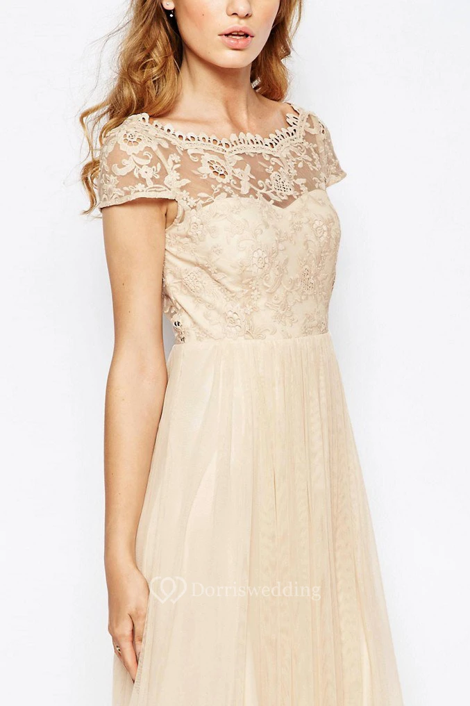 Ankle-Length Appliqued Scoop Neck Cap Sleeve Tulle Bridesmaid Dress