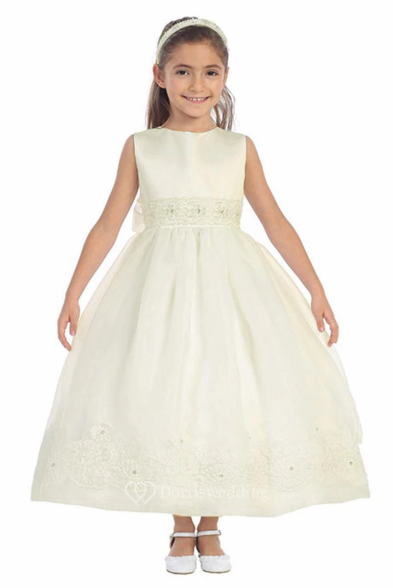 Ankle-Length Beaded Floral Lace&Organza Flower Girl Dress With Sash