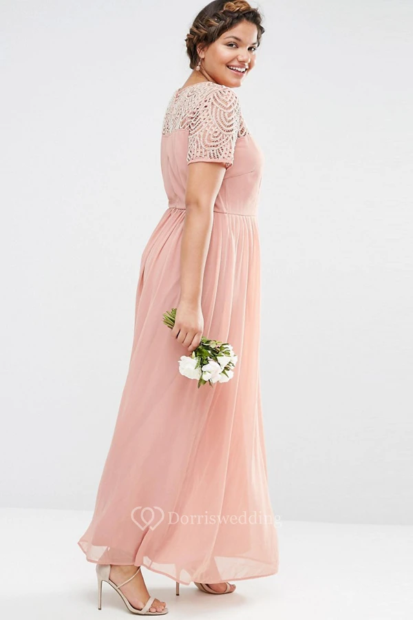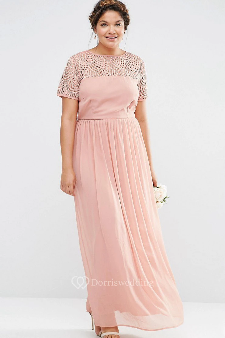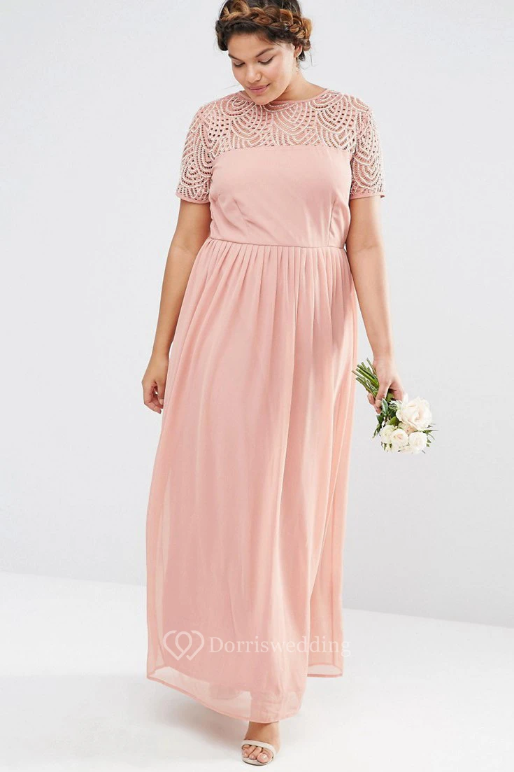 Ankle-Length Beaded Short Sleeve Scoop Neck Chiffon Bridesmaid Dress