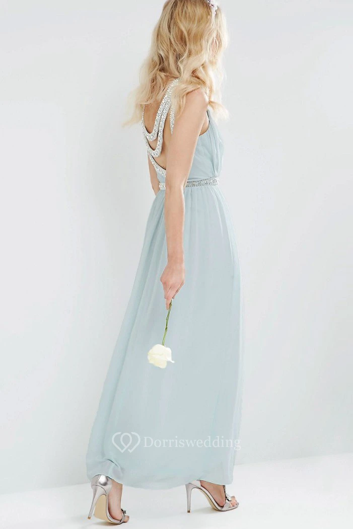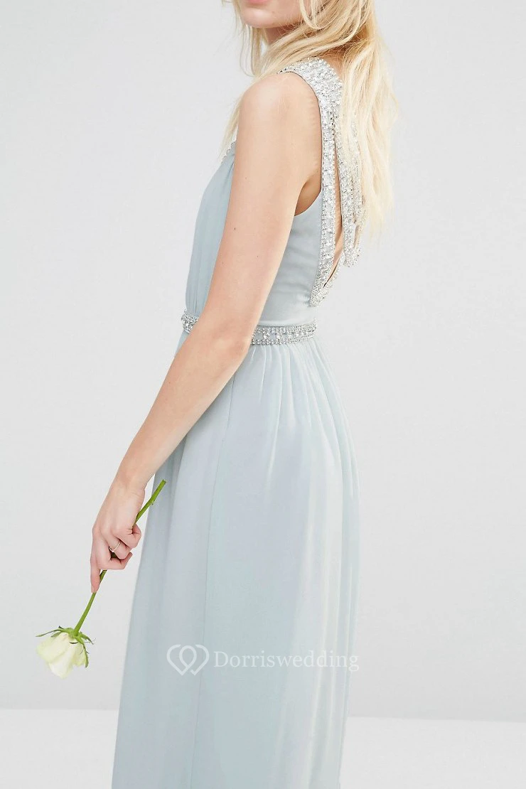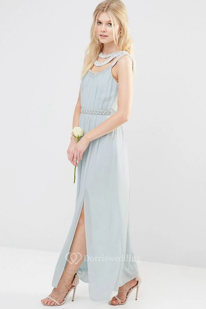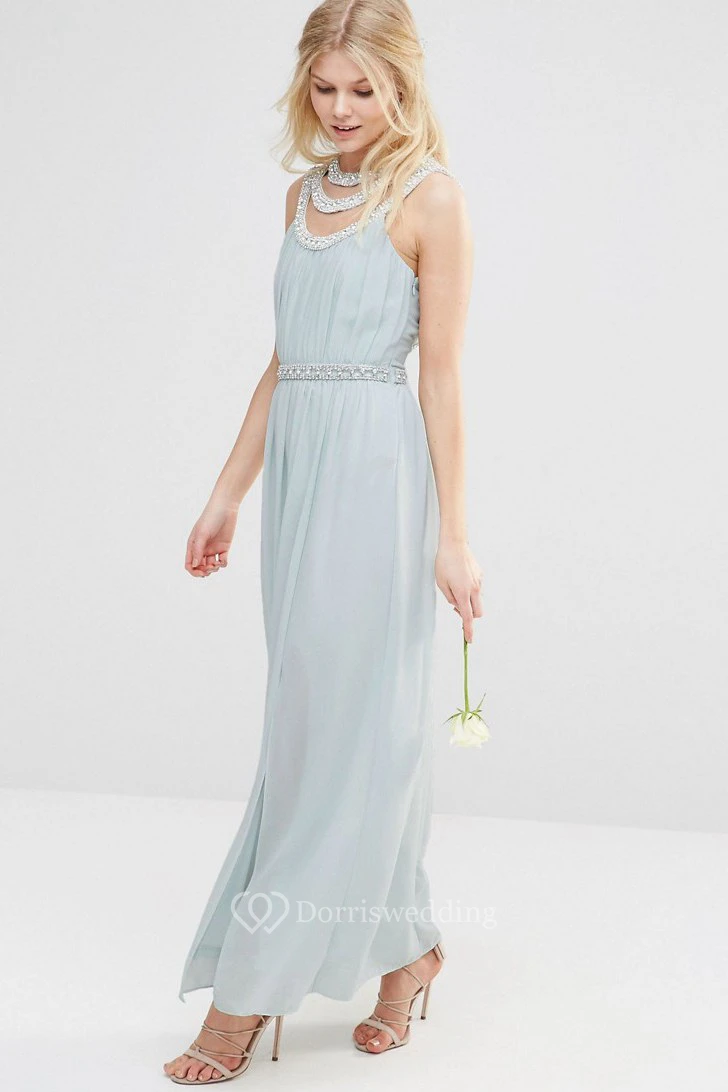 Ankle-Length Beaded Sleeveless Scoop Neck Chiffon Bridesmaid Dress With Straps