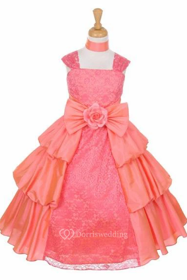 Ankle-Length Bowed Floral Lace&Taffeta Flower Girl Dress With Ribbon