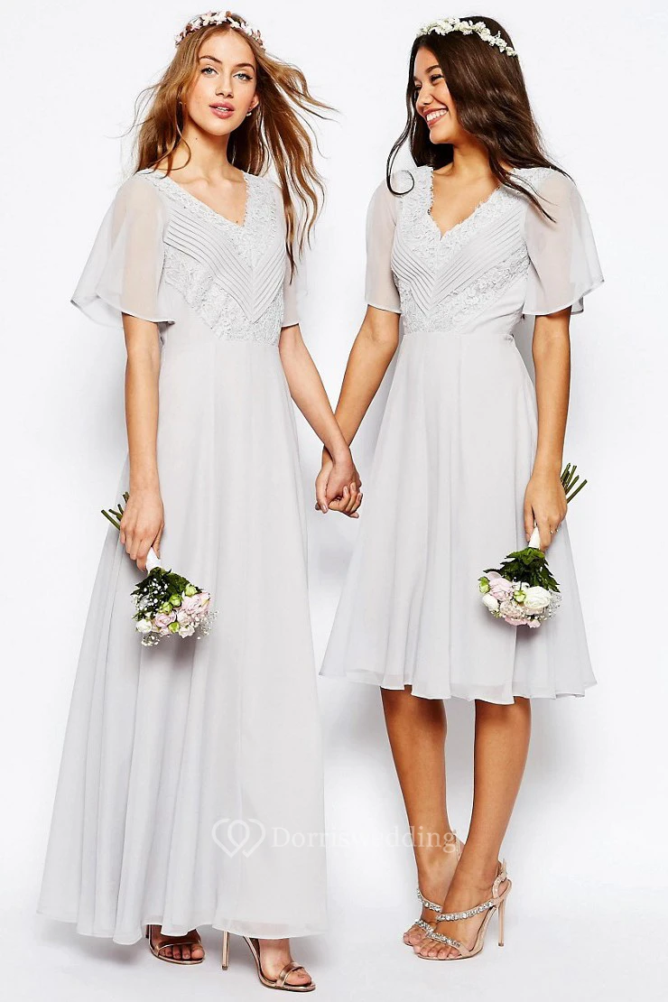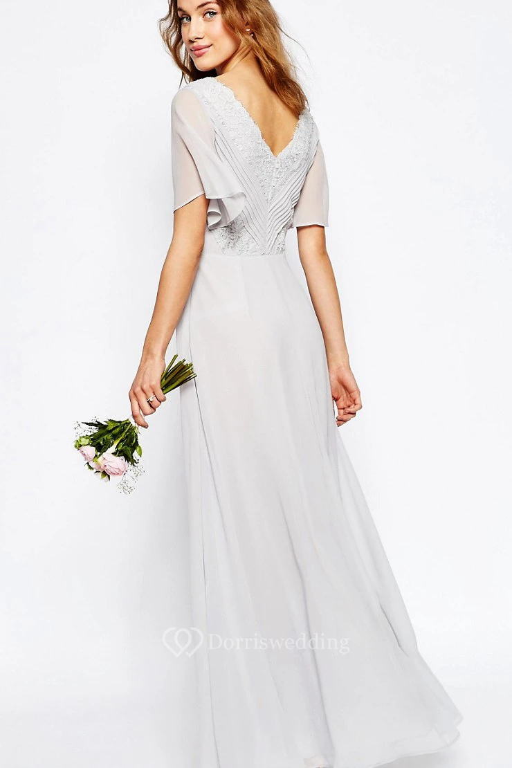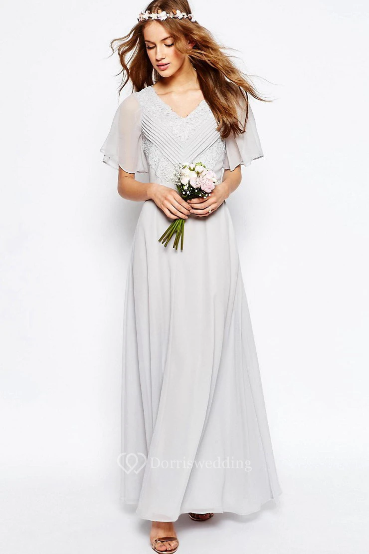Ankle-Length Ruched V-Neck Poet Sleeve Chiffon Bridesmaid Dress With Appliques