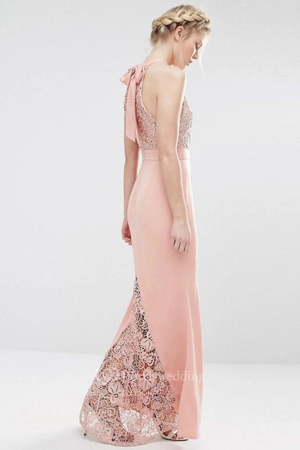 Ankle-Length Sheath Lace High Neck Sleeveless Chiffon Bridesmaid Dress With Bow