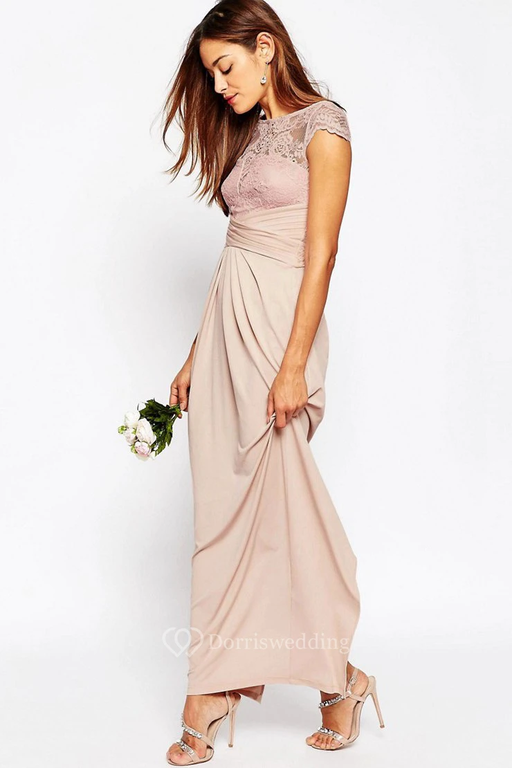 Ankle-Length Sheath Ruched Jewel Neck Cap Sleeve Chiffon Bridesmaid Dress