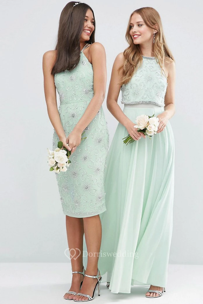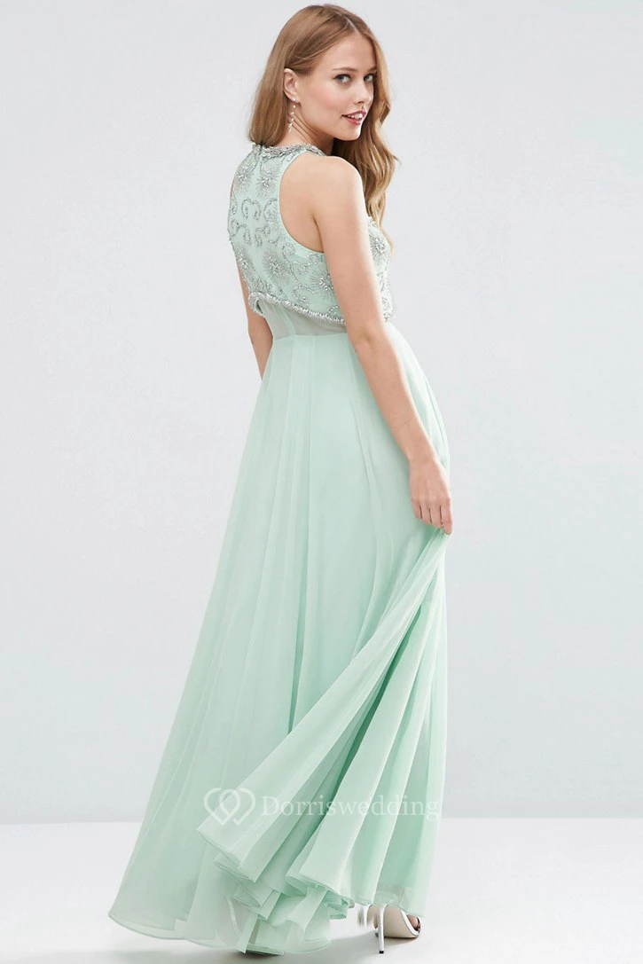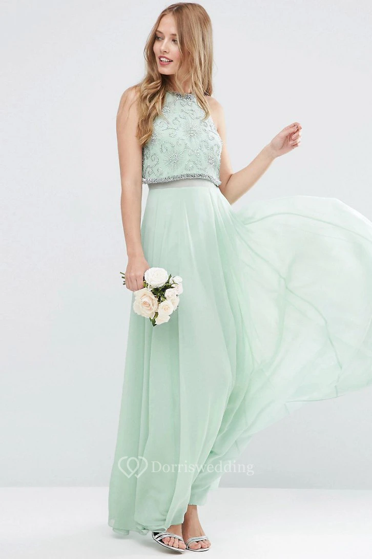 Ankle-Length Sleeveless Jewel Neck Beaded Chiffon Bridesmaid Dress With Pleats