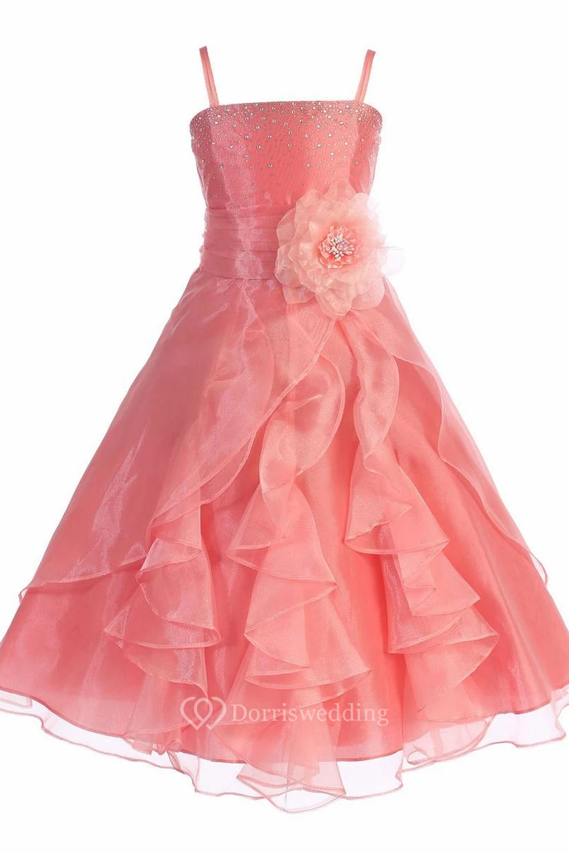 Ankle-Length Split Beaded Floral Organza Flower Girl Dress With Ribbon