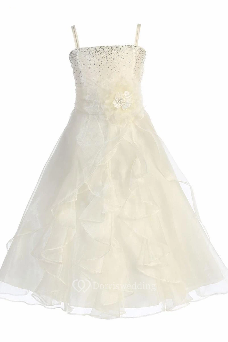 Ankle-Length Split Floral Beaded Organza Flower Girl Dress With Sash