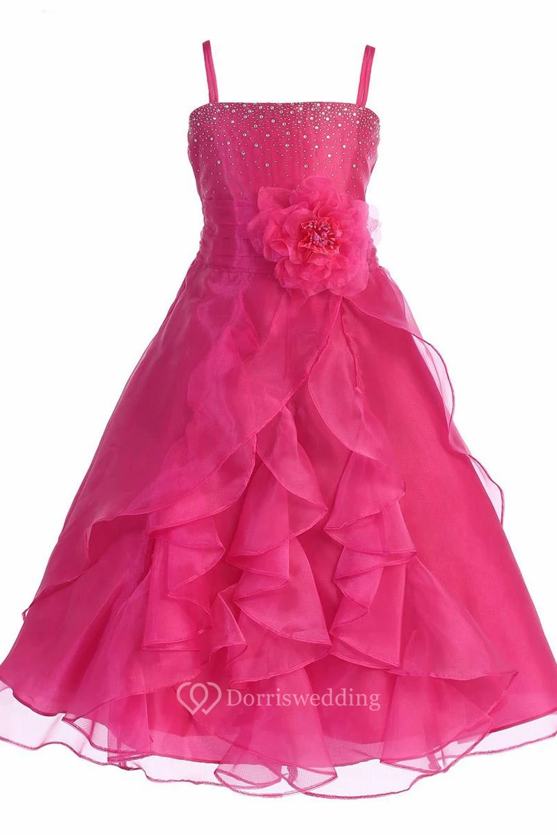 Ankle-Length Split Floral Beaded Organza Flower Girl Dress With Sash