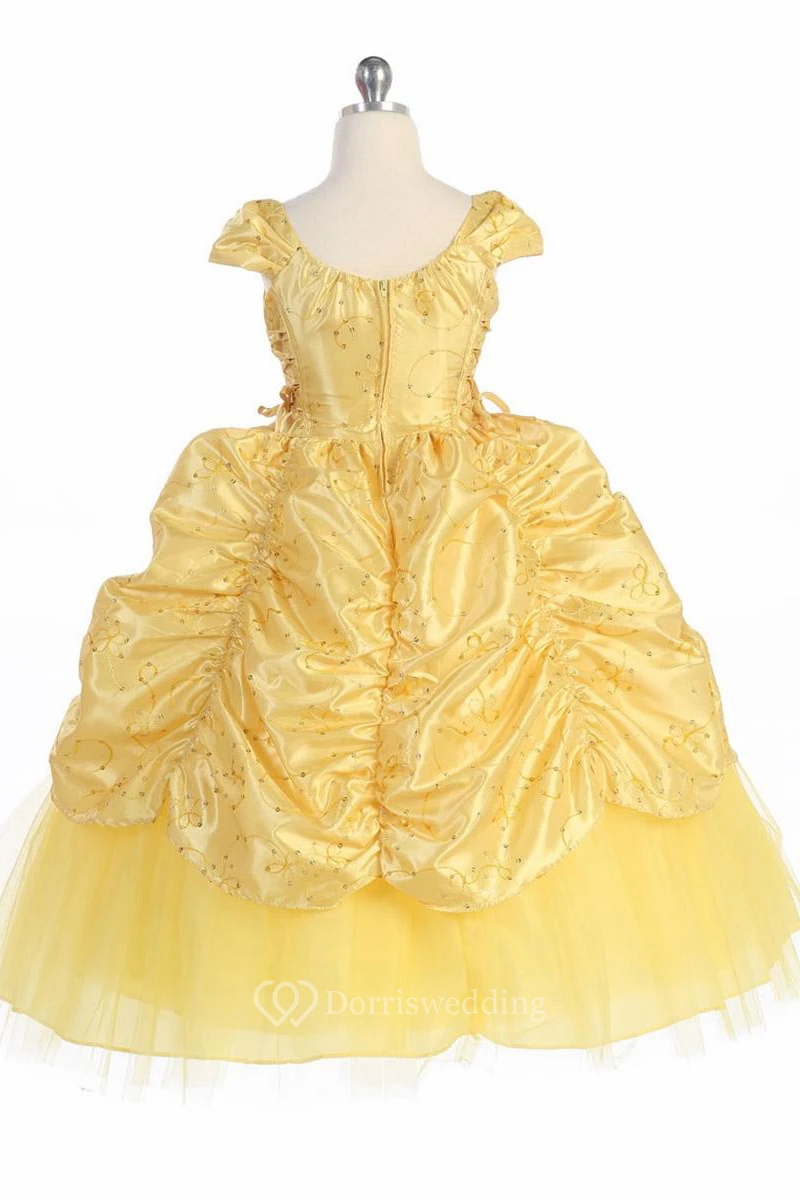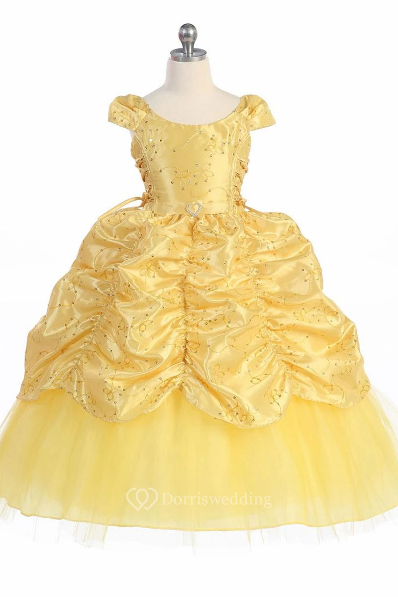 Ankle-Length Tiered Embroideried Lace&Taffeta Flower Girl Dress With Broach