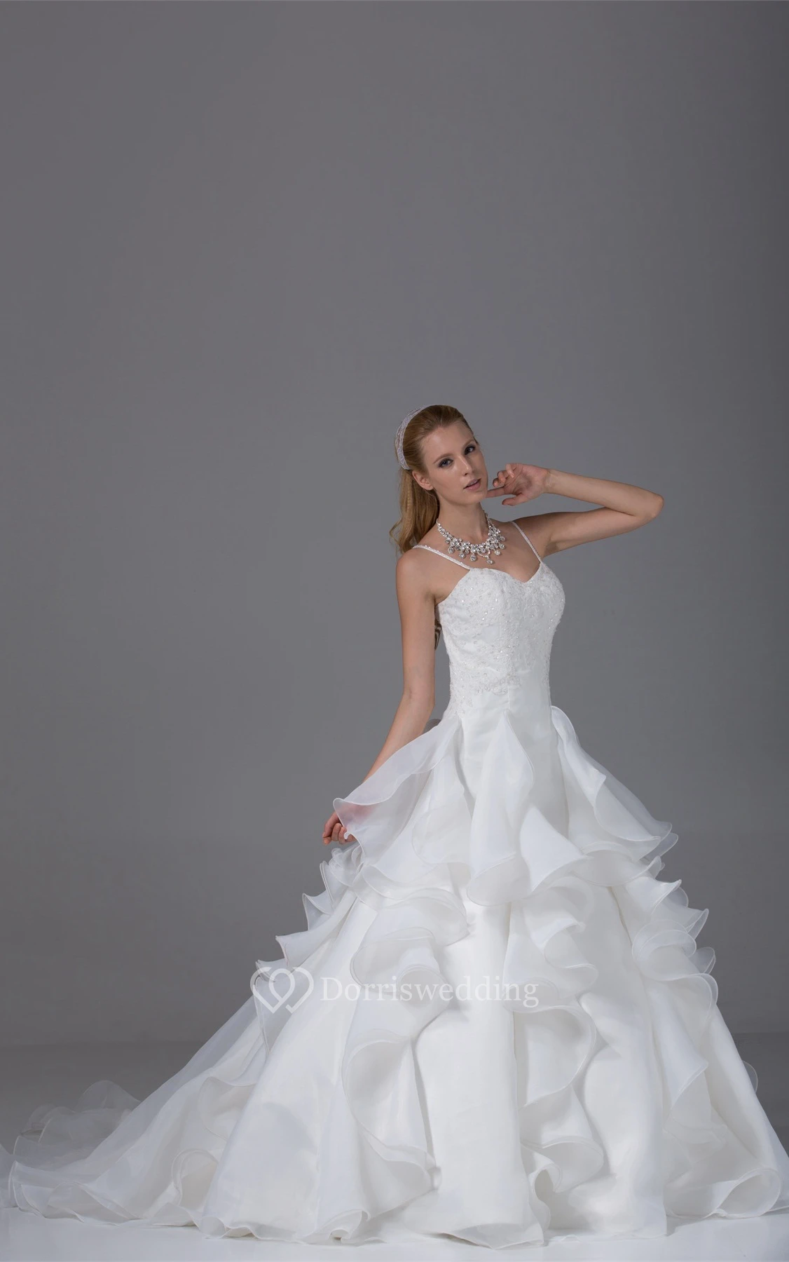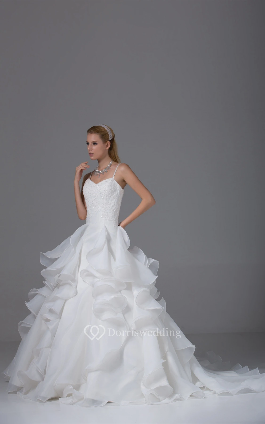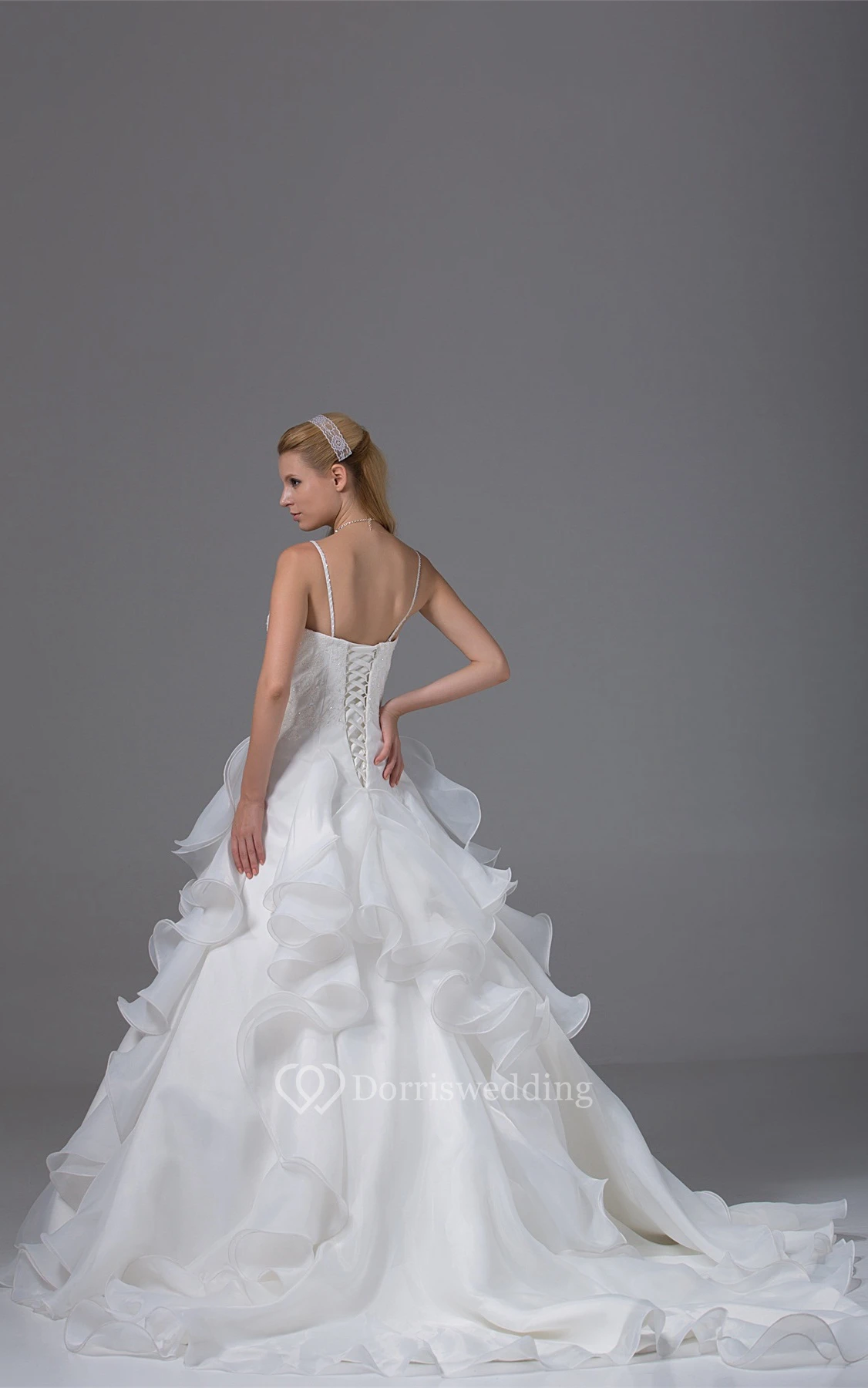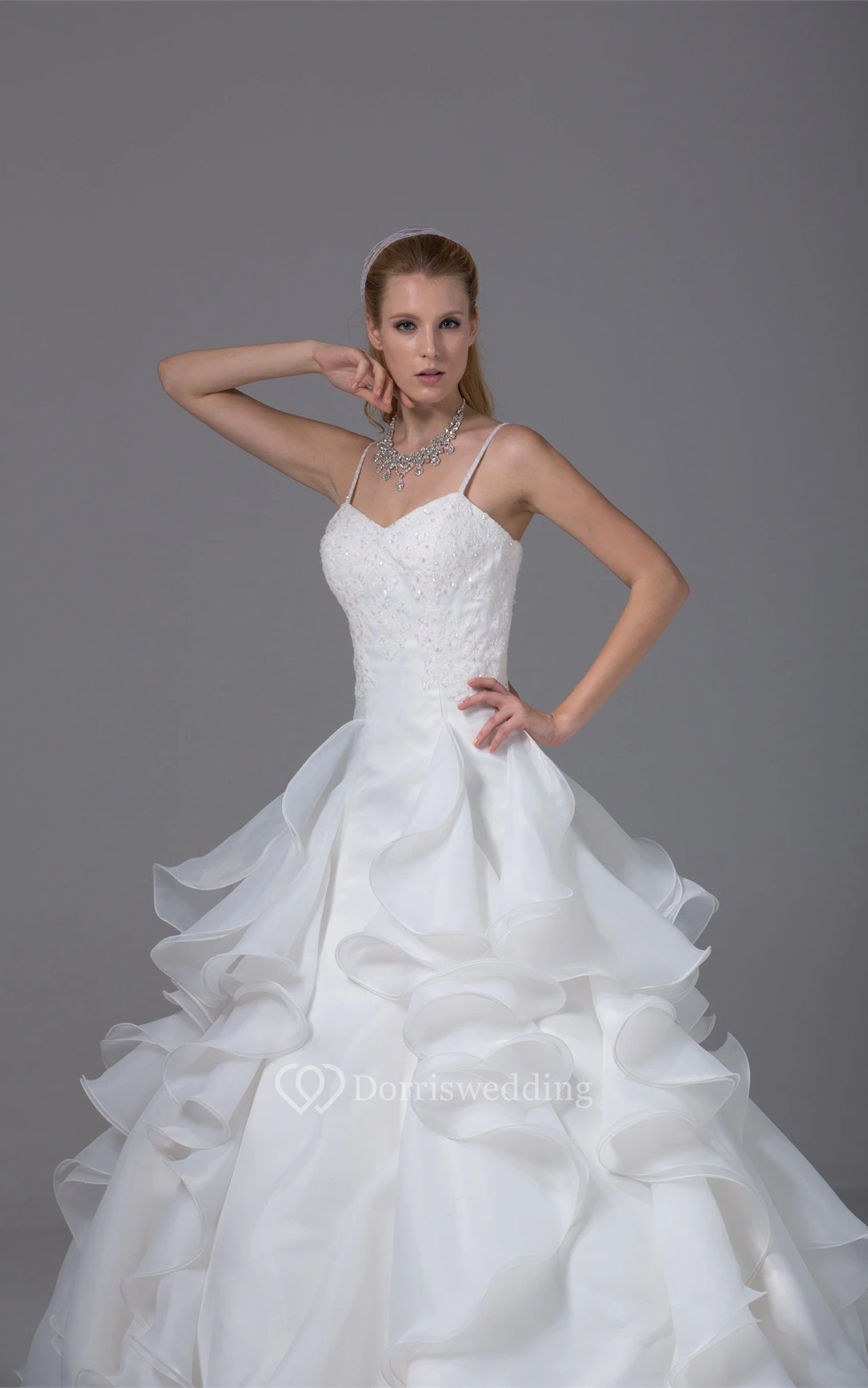 Appliqued A-Line Ruffled Corset Back and Gown With Spaghetti Straps