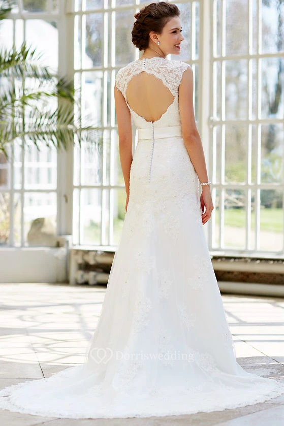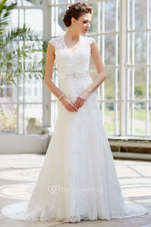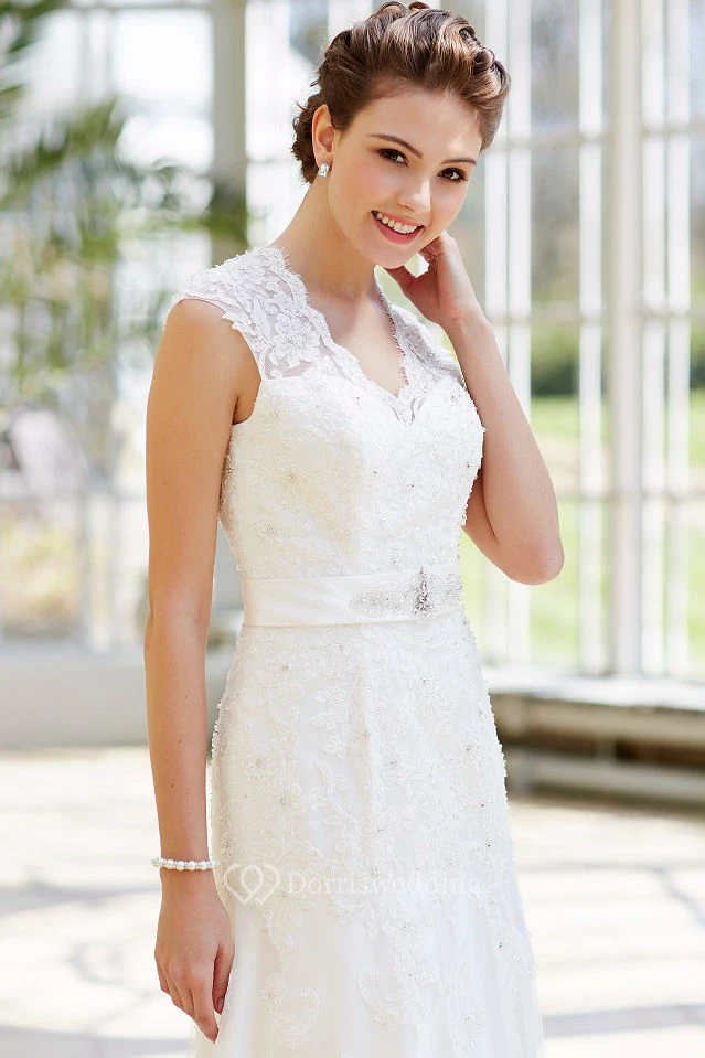 Appliqued Maxi V-Neck Cap-Sleeve Lace Wedding Dress With Waist Jewellery