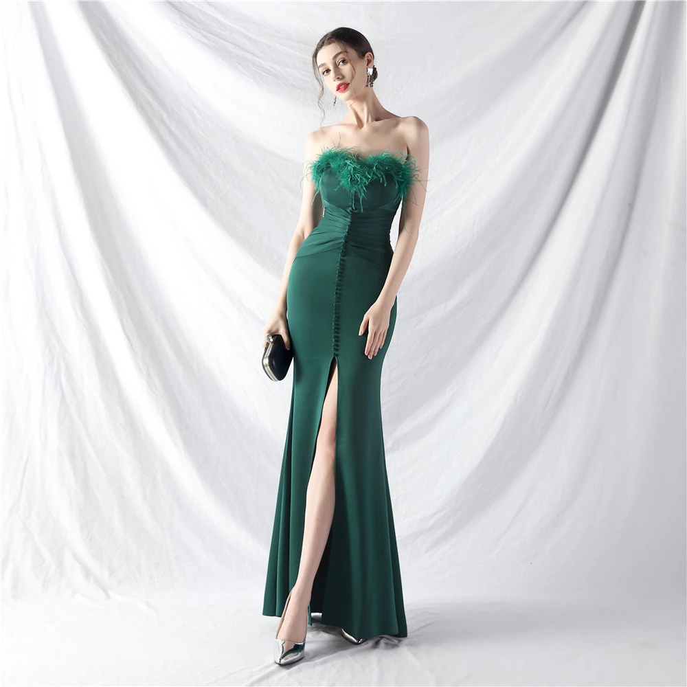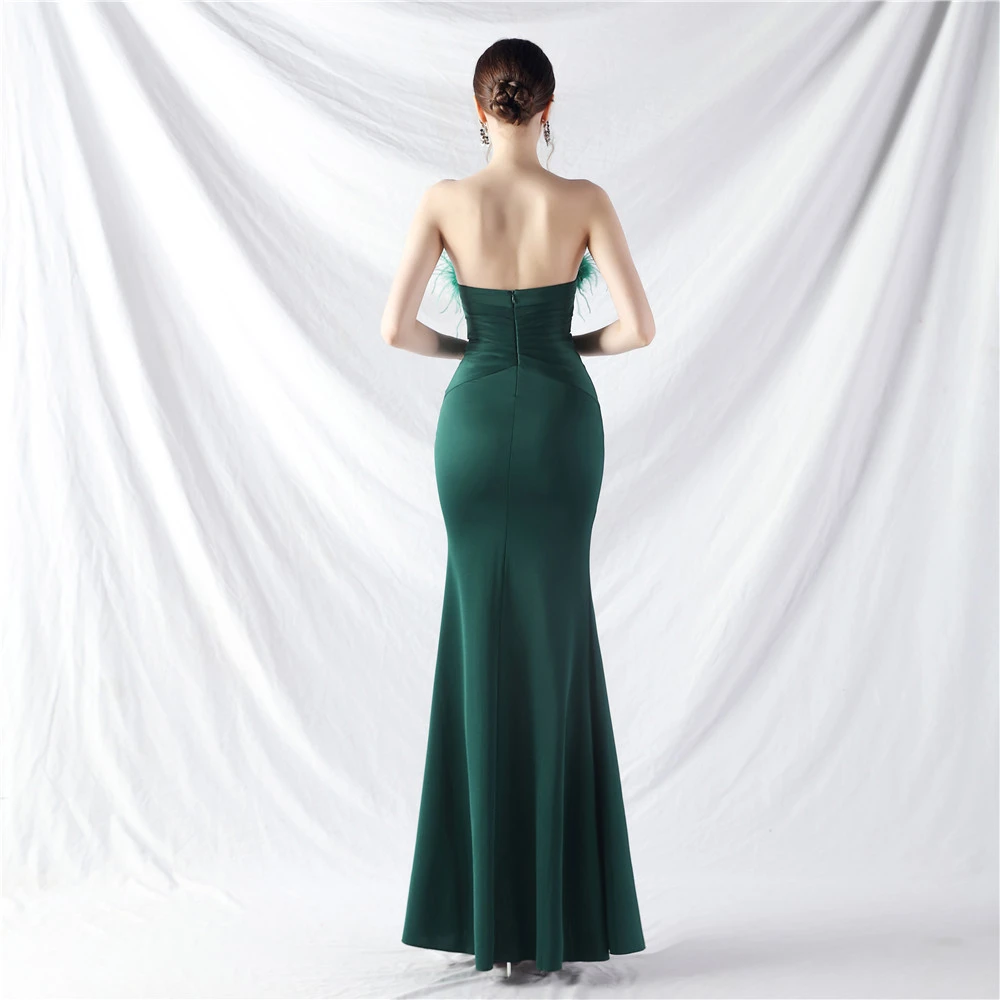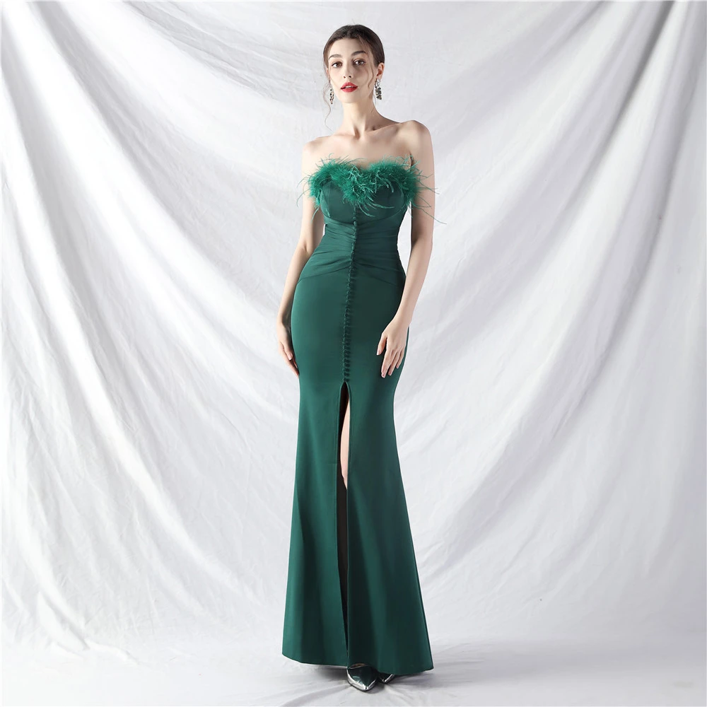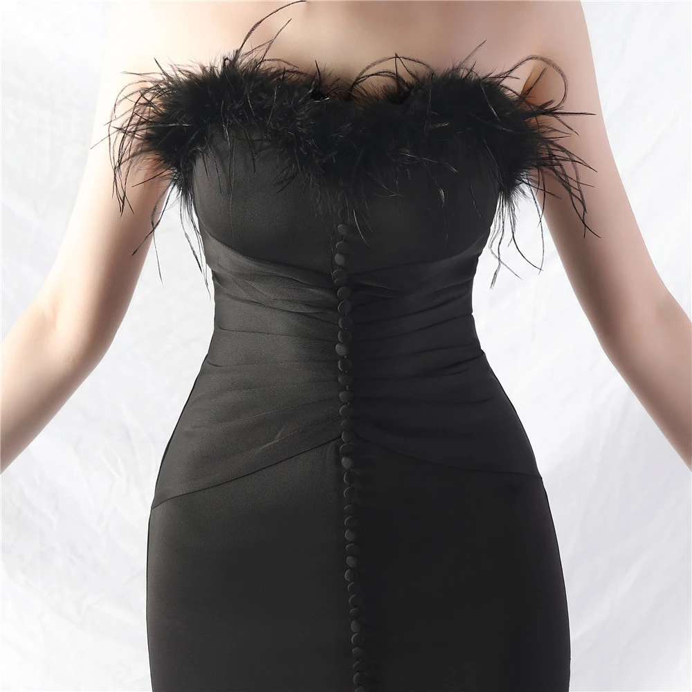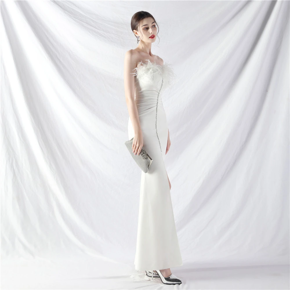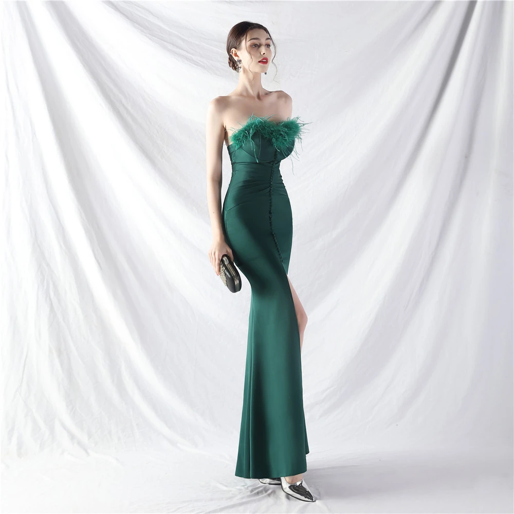 Artistic Buckle Hand-Made Ostrich Feather Satin Long Evening Dress